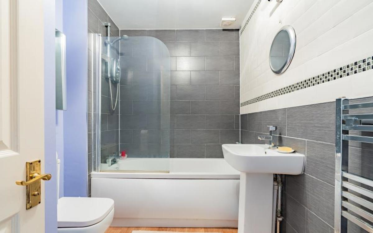 The bathroom is well appointed, featuring a bath with an overhead shower, a toilet, and a hand basin. This space is designed for relaxation, offering a retreat after a long day.