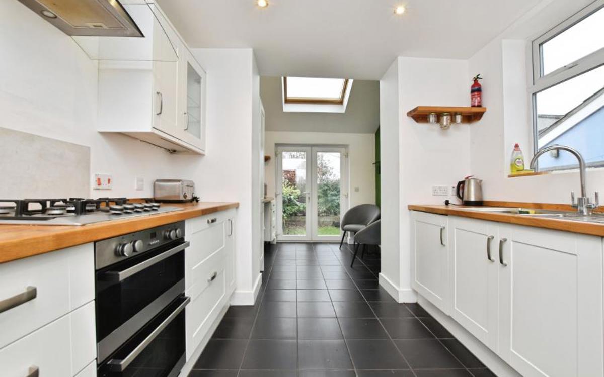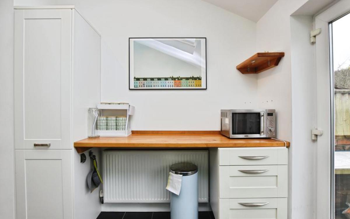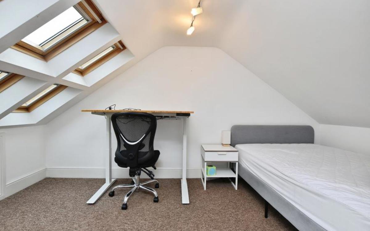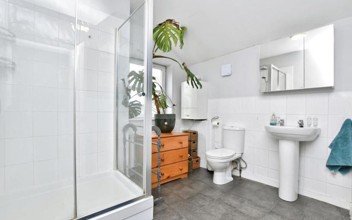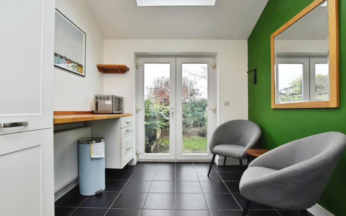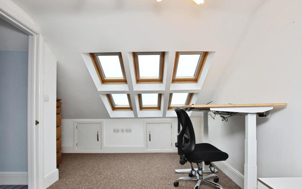 On the ground floor, an open-plan reception room with large windows creates a bright living and entertaining space. The open-plan kitchen features a dedicated dining area with Velux windows, enhancing natural light and providing a pleasant setting for everyday use. A second open-plan reception room offers additional flexibility for living or workspace needs. The property includes practical bike storage.