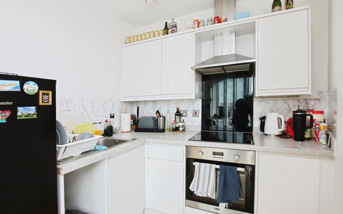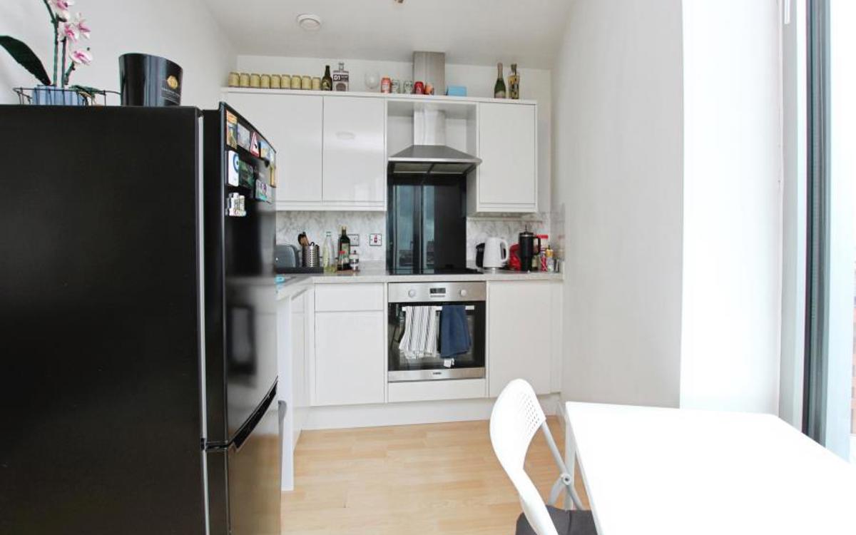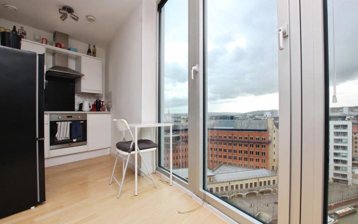 This bright and well-presented apartment benefits from impressive floor-to-ceiling windows that flood the space with natural light and offer stunning city views. The open-plan living area includes a modern kitchen with electric oven and hob, plus space for a dishwasher and freestanding fridge/freezer, alongside a comfortable area for dining and relaxing. A utility cup...