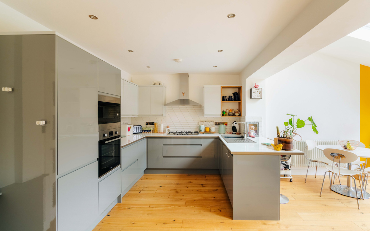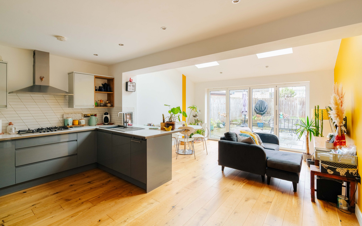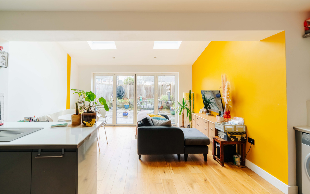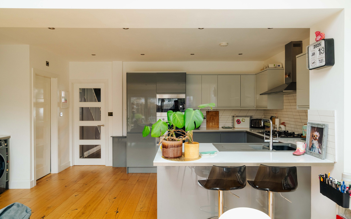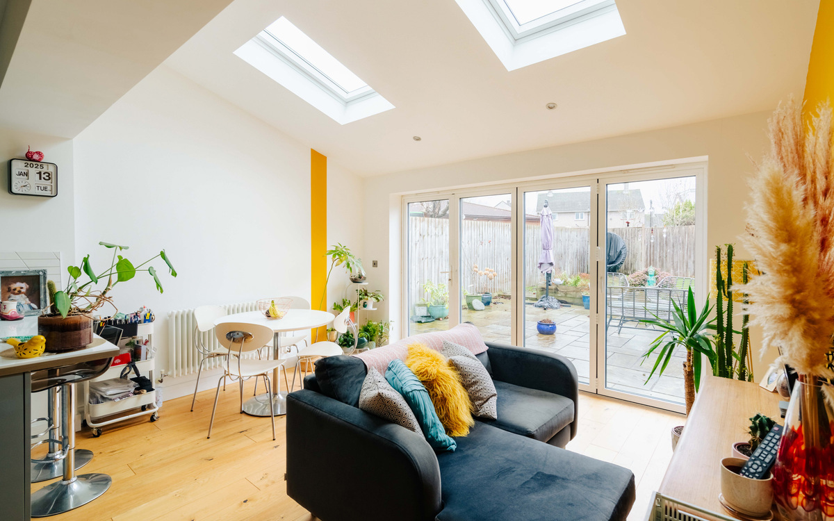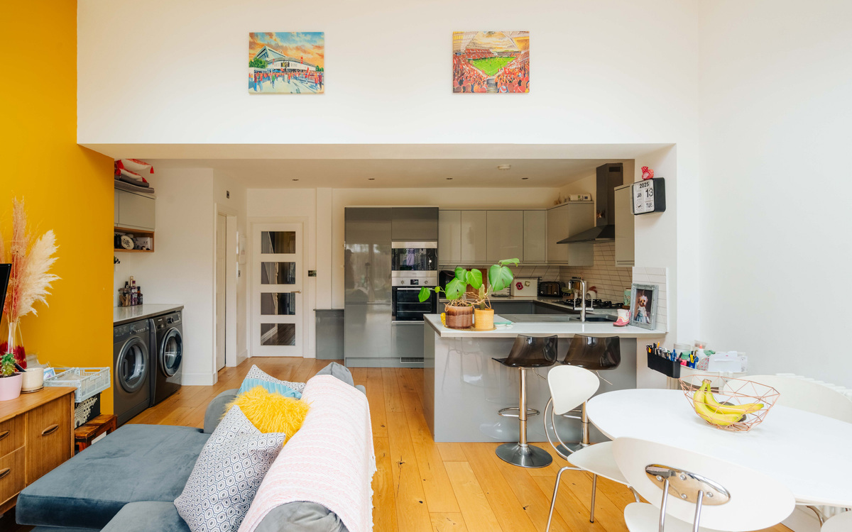 The kitchen itself is a contemporary handleless style and has ample cupboard and counter space including two large pan drawers and a breakfast bar. The appliances are fully integrated with a fridge/freezer, dishwasher, double oven and large gas hob. The extension has space for a good sized dining table, as well as room for a second lounge area, while there is also a WC and dedicated space for a washing machine and dryer. Natural light pours in through Velux windows in the roof of the extension and bi-folding doors on to the garden.