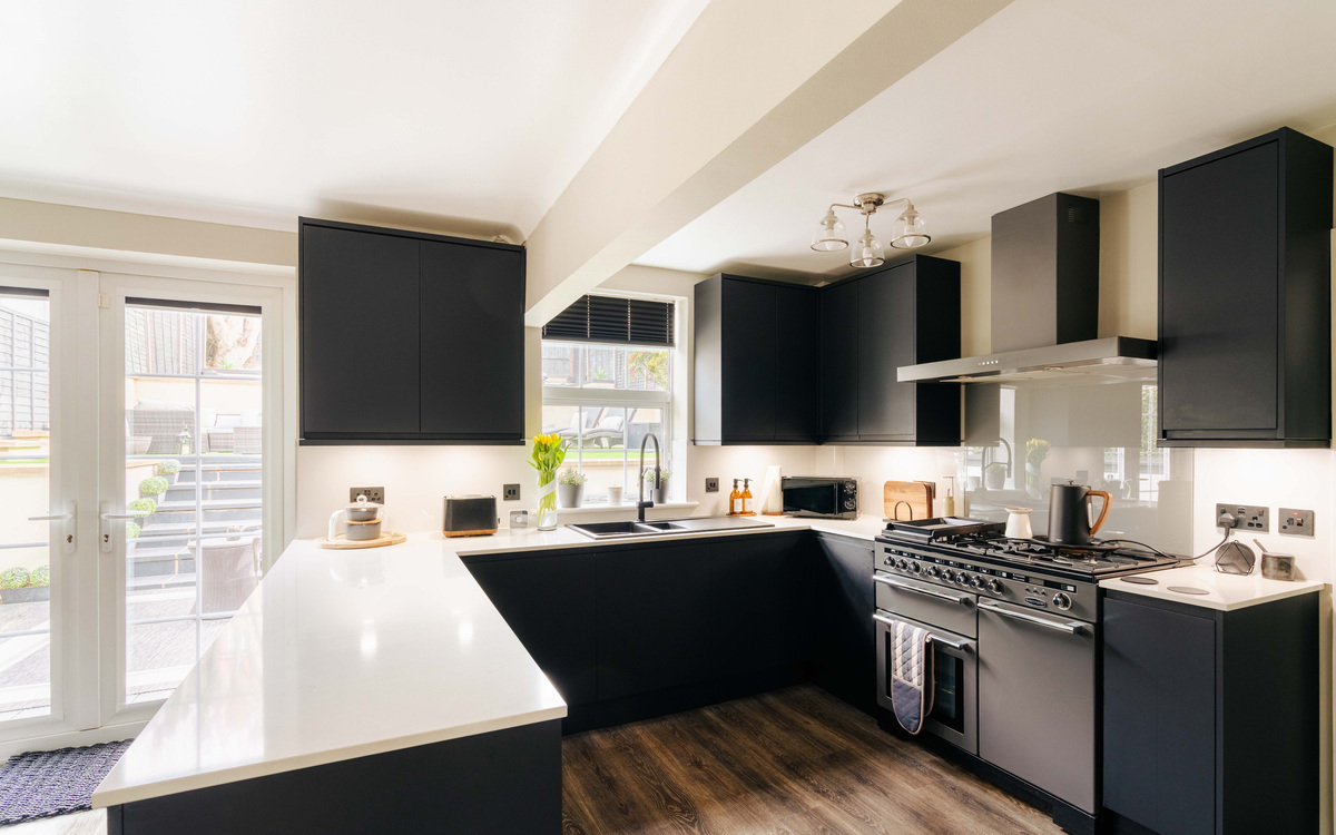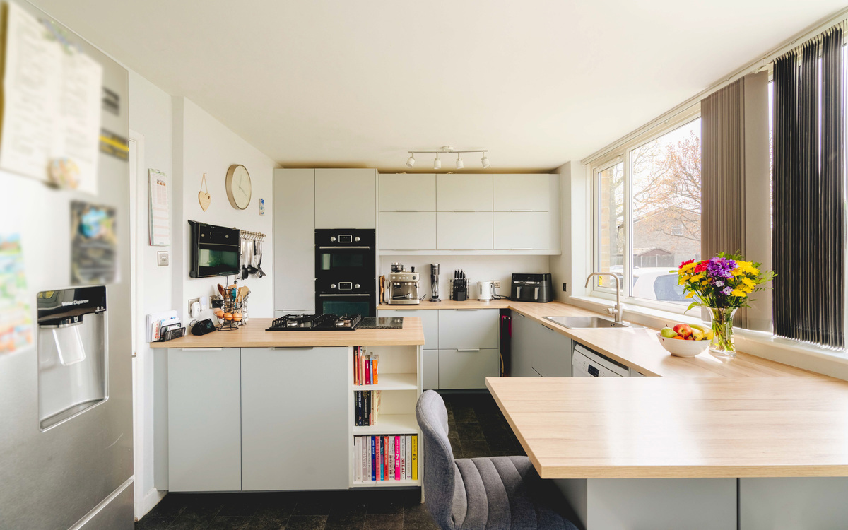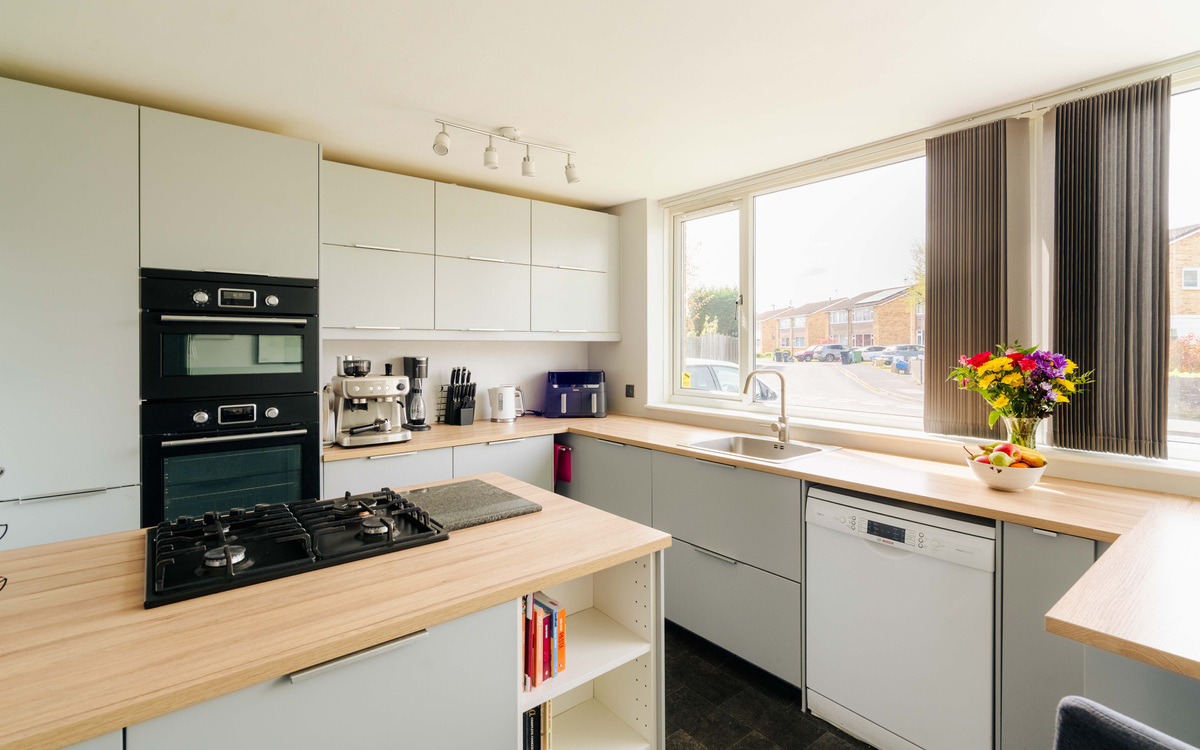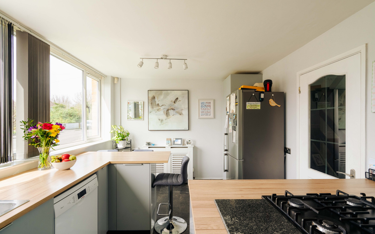 At the front of the home sits the kitchen, with large windows flooding the room with natural light, creating a bright and welcoming space. The kitchen has been designed with socialising in mind — the hob is positioned within the island, allowing for those cooking to remain included, while the built-in breakfast bar provides the perfect spot for morning coffees or casual dining.