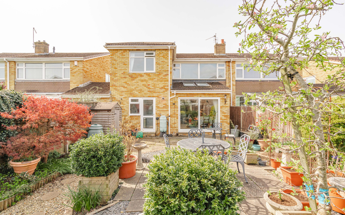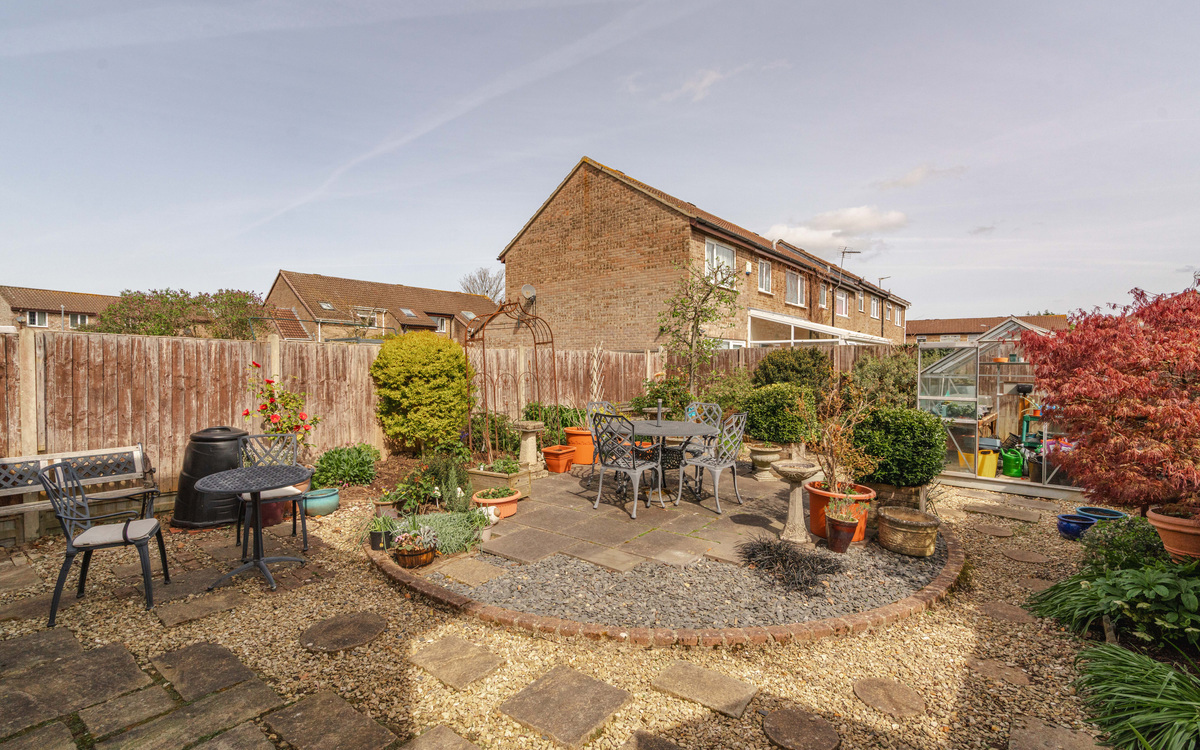 The rear garden is accessed via sliding doors from the spacious lounge/diner, creating a seamless indoor-outdoor flow. Designed with low maintenance in mind, the garden offers a pleasant open outlook, making it a great space to unwind without the upkeep of a traditional lawn. The property also benefits from an integral garage, providing excellent storage.