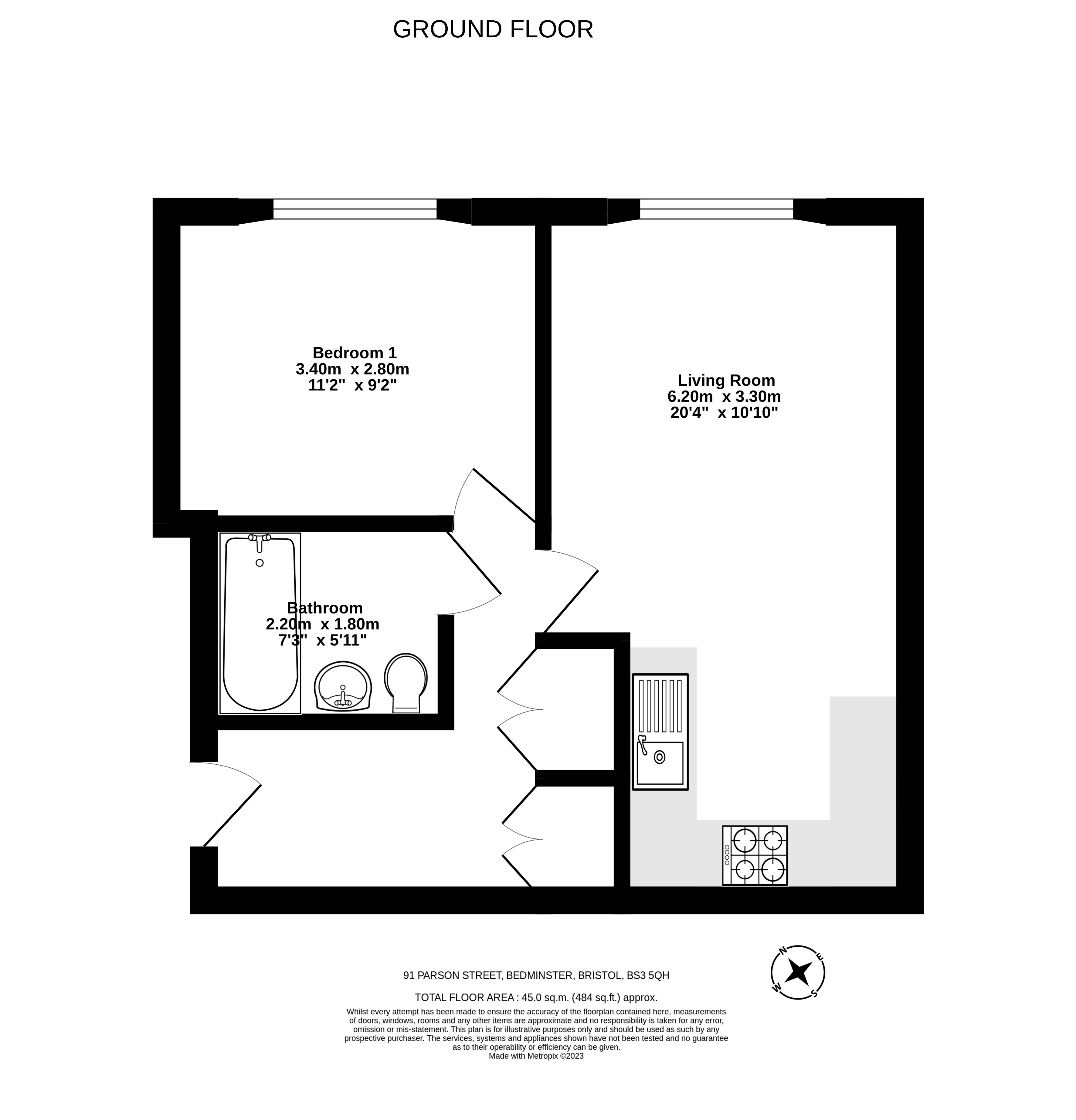 Upon entering the property, you are greeted by a hallway which has 2 storage cupboards and leads you to a well-lit living area. The large windows flood the room with natural light, creating a bright and airy atmosphere. The living area merges to the fitted kitchen, offering storage space and modern appliances. The bedroom has space for free standing furniture and again has a large window. The bathroom is fitted with bath, wc, heated towel rail and sink. Furthermore, this property benefits from a designated parking space.