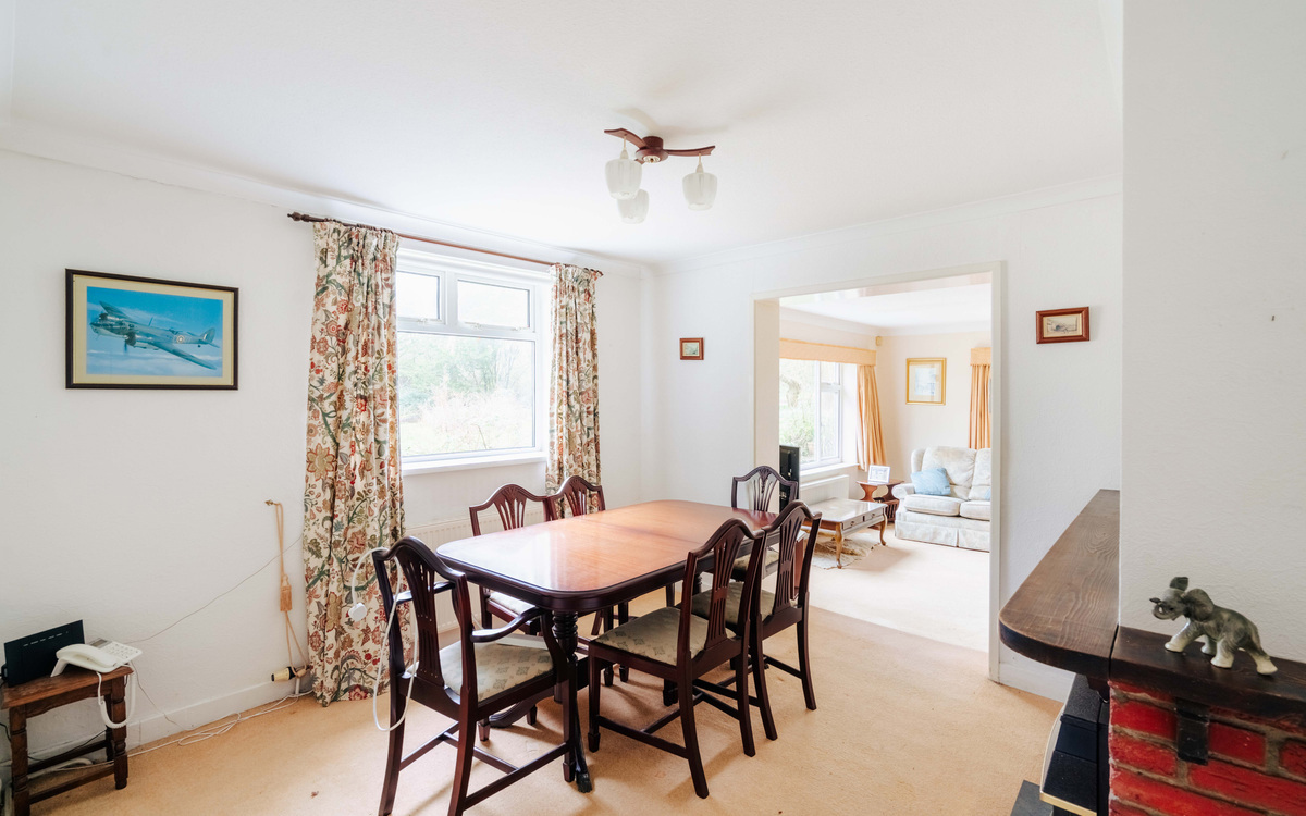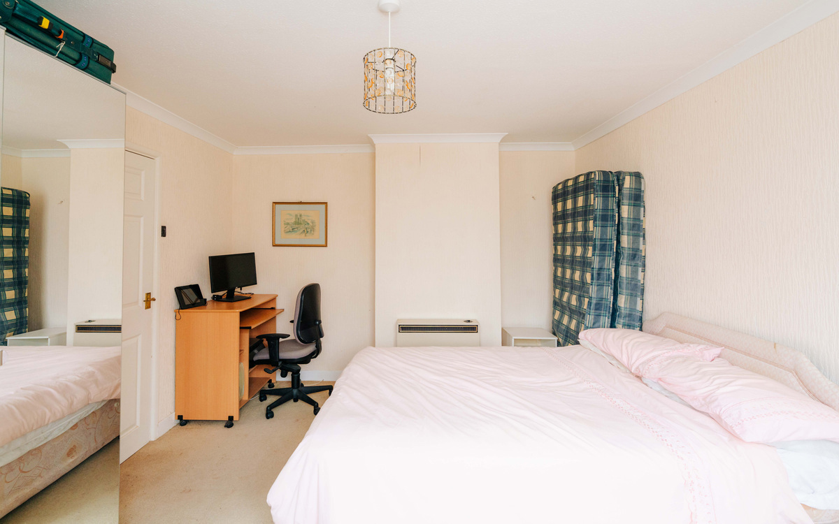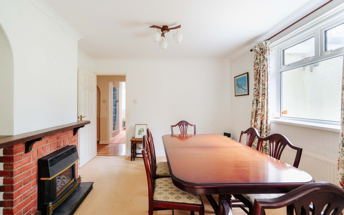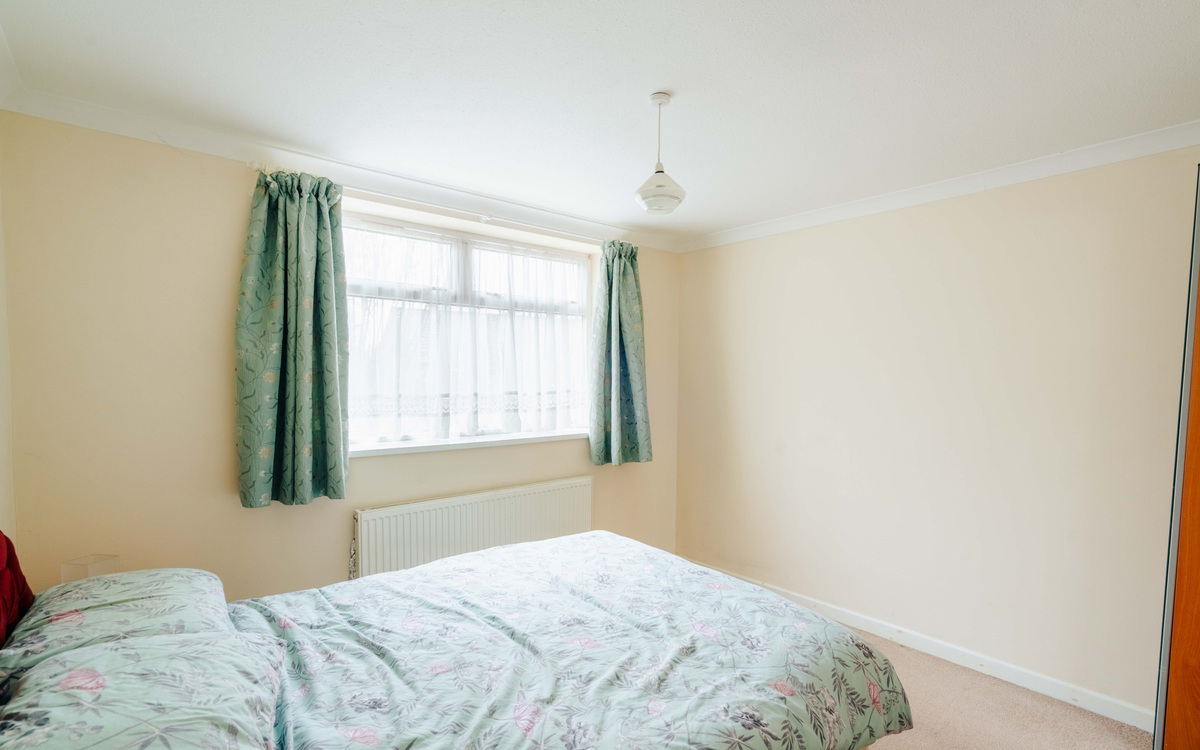 Also off the hallway are the living and dining rooms which offer generous socialising space thanks to another extension to the house. There is plenty of light coming in through the large east facing windows and the patio doors on to the southern side of the garden. The main bedroom is off the living room and as well as another south facing window, there is integrated wardrobe space running along one side.