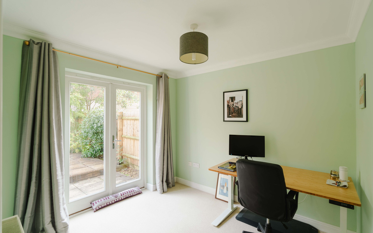 You enter into a spacious hallway on the ground floor, and this level has the third double bedroom that has doors to the garden.