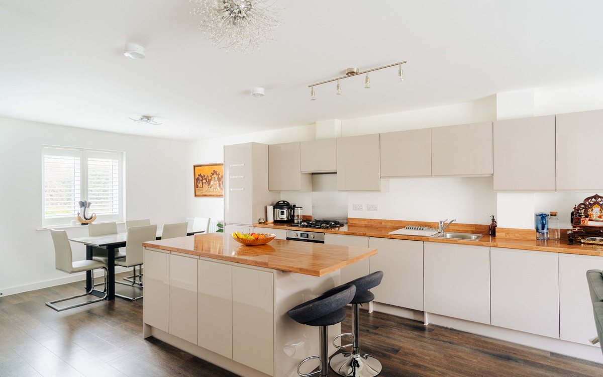 As you head upstairs, you find the spacious open plan kitchen/dining/living space.