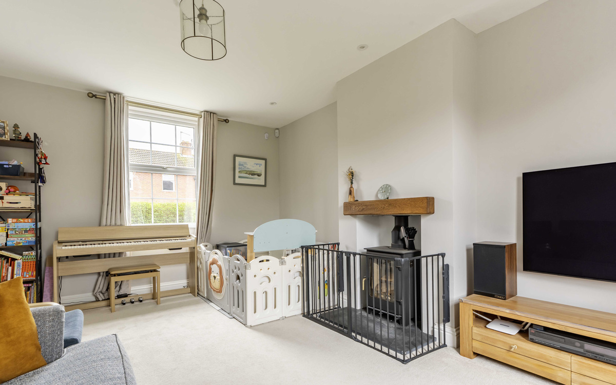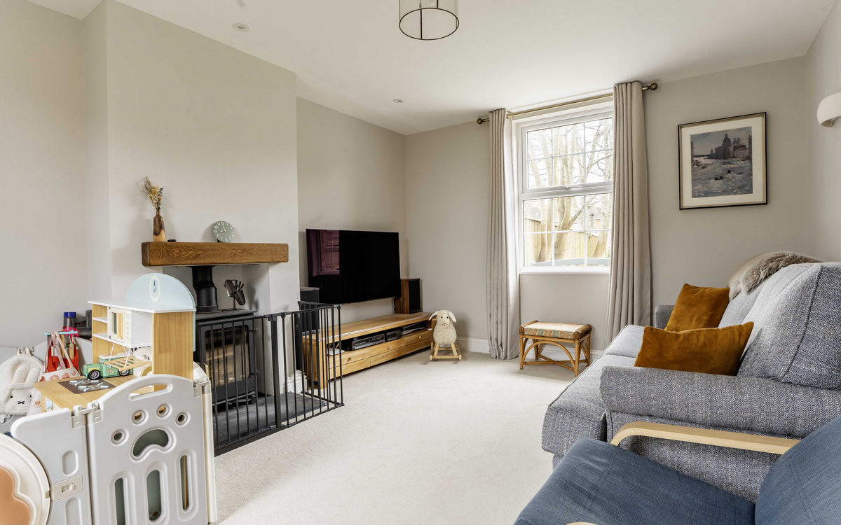 - Large living room with dual aspect windows and log burner