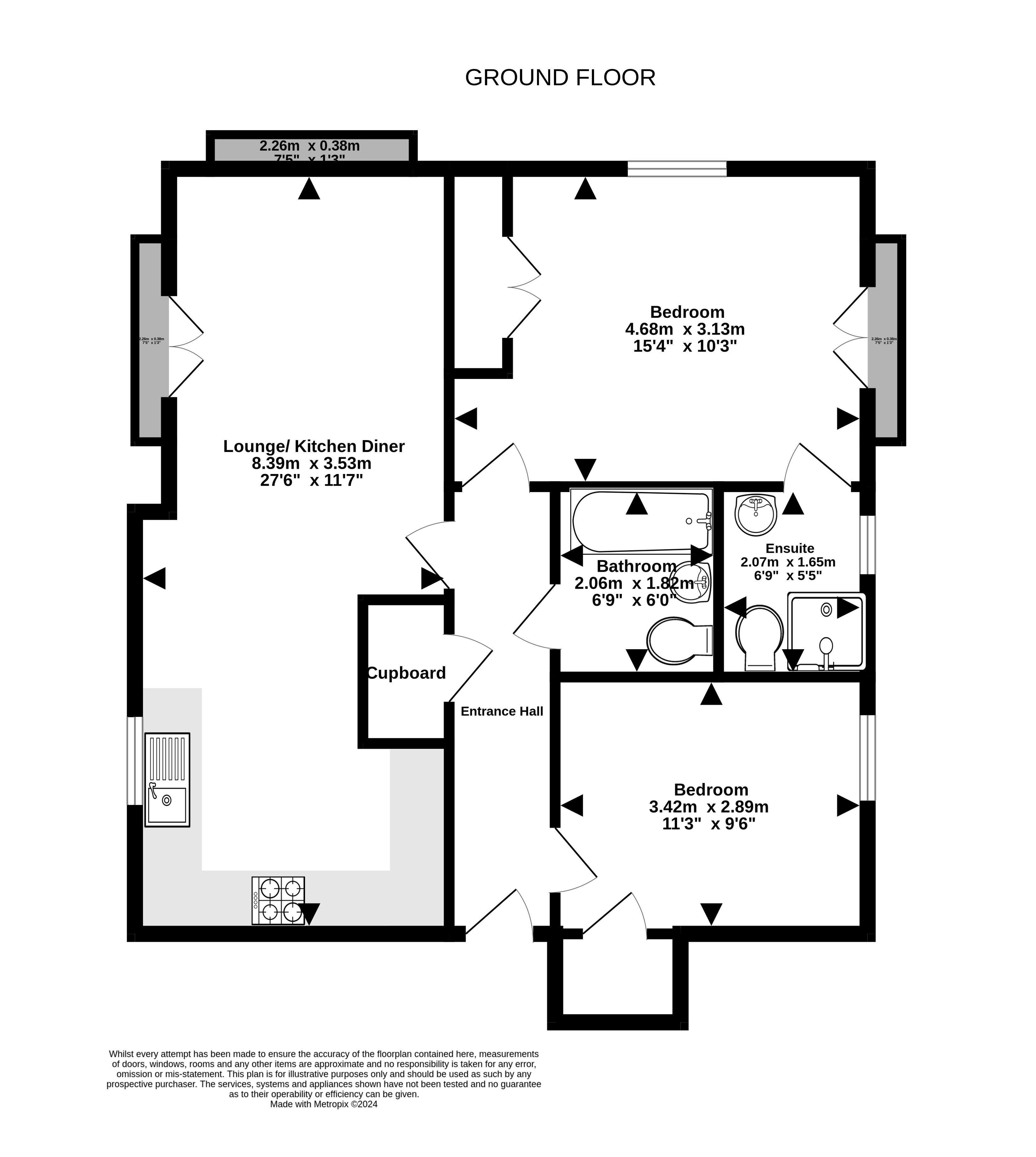 Upon entering, a spacious hallway welcomes you, leading to a large open plan kitchen/diner lounge area. The lounge features two sets of Juliet balconies with beautiful views of the marina. The kitchen is fully equipped with an oven, hob, dishwasher, fridge freezer, and room for a washing machine. Off the hallway, you will find two bedrooms, with the master bedroom boasting an en-suite shower room and fitted wardrobes. There is also a three-piece family bathroom suite and 2 handy storage cupboards.