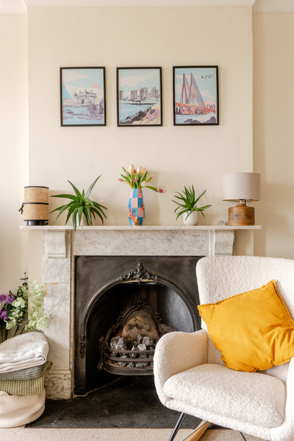 - Spacious, light-filled living room with high ceilings and marble fireplace