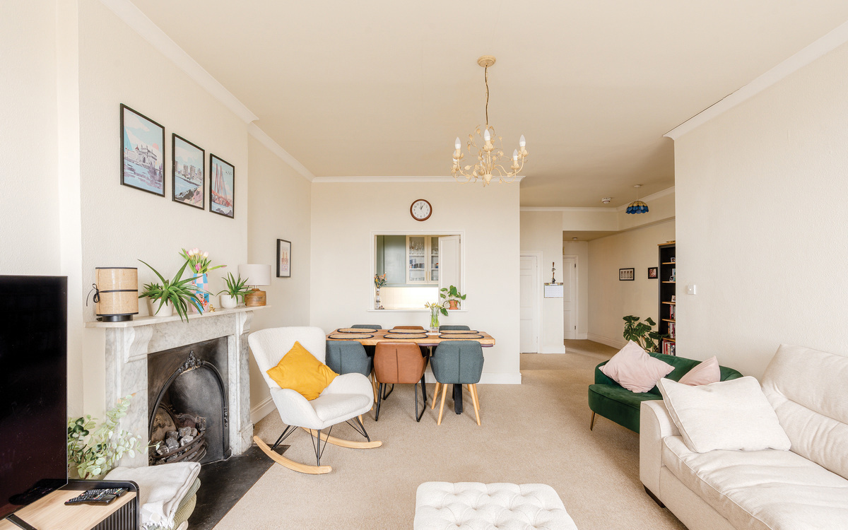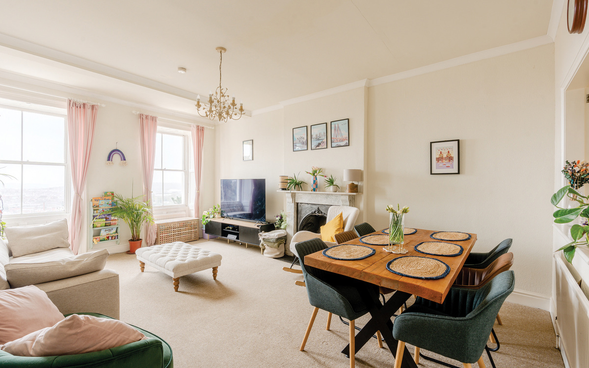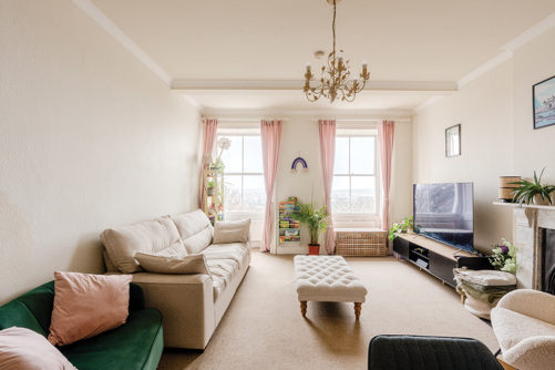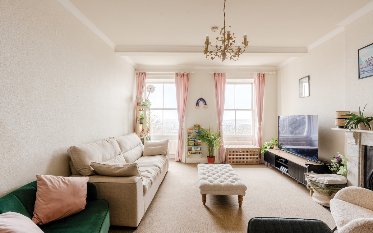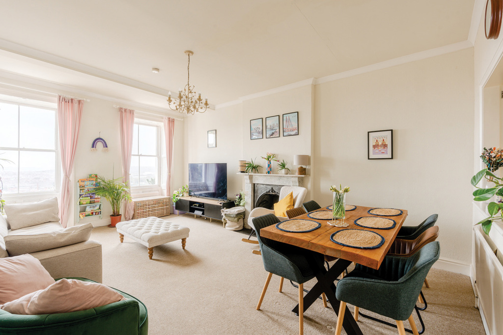 Enjoy breathtaking panoramic views toward Bath from this spacious 2 bed second-floor flat on Royal York Crescent. High ceilings, floods of natural light, and use of a terrace.