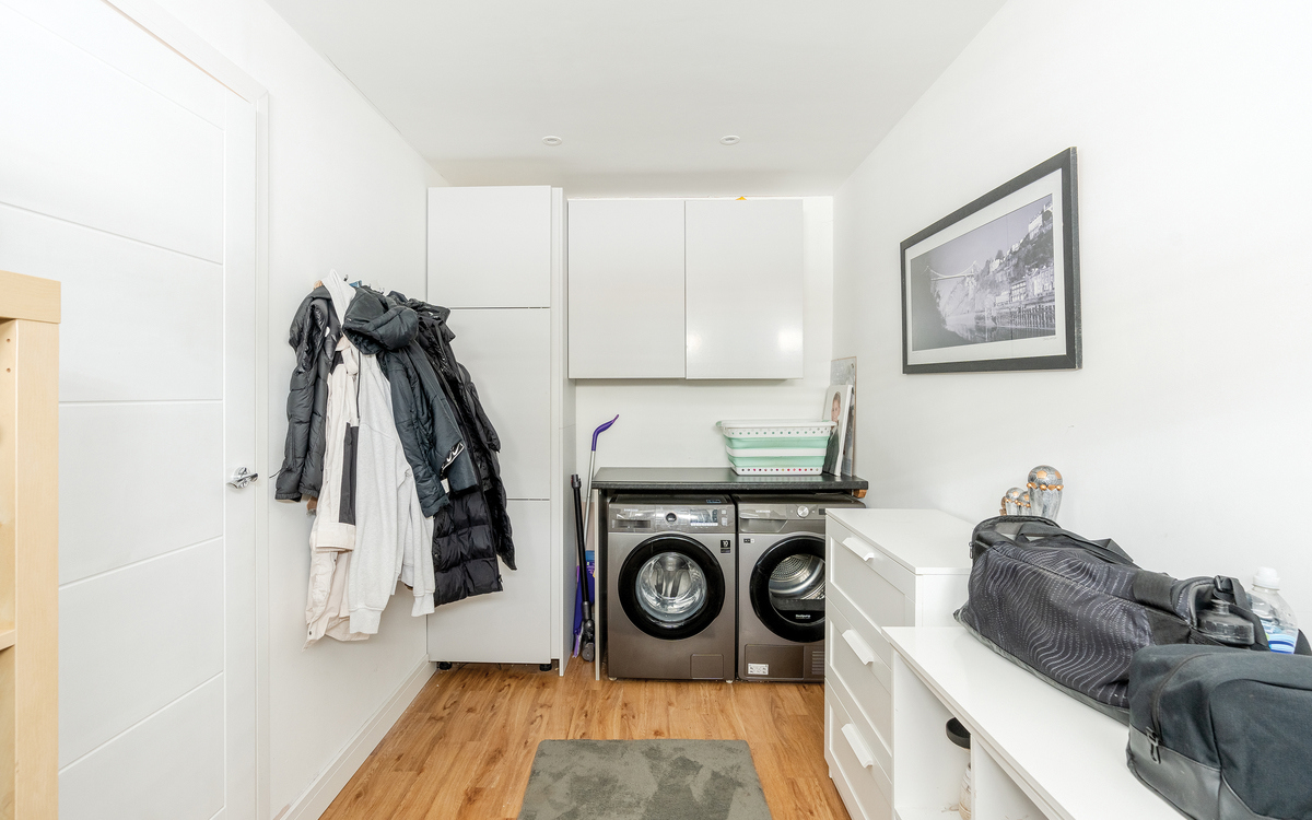 Upon entering, you are welcomed by a spacious and bright entrance hall with high ceilings and warm oak floors. The hall leads to a utility room, family bathroom, and a study. Towards the back of the property, there is a large open plan kitchen, lounge, and diner with sliding glass doors that open onto a Juliet balcony. The kitchen is equipped with integrated appliances...