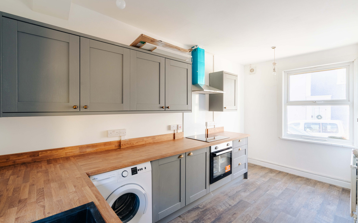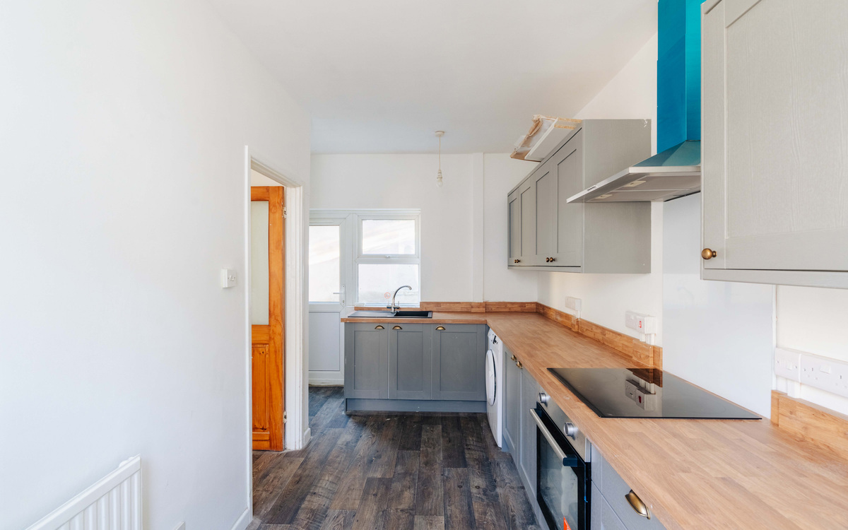 On the ground floor of this terraced home, you enter into the living room which has plenty of space for sofas and other furniture as well as a fireplace. There is plenty of light coming in through the window and the front door. The kitchen is next and has a good amount of cupboard and counter space, spaces for a washing machine, fridge/freezer and free-standing oven/hob...
