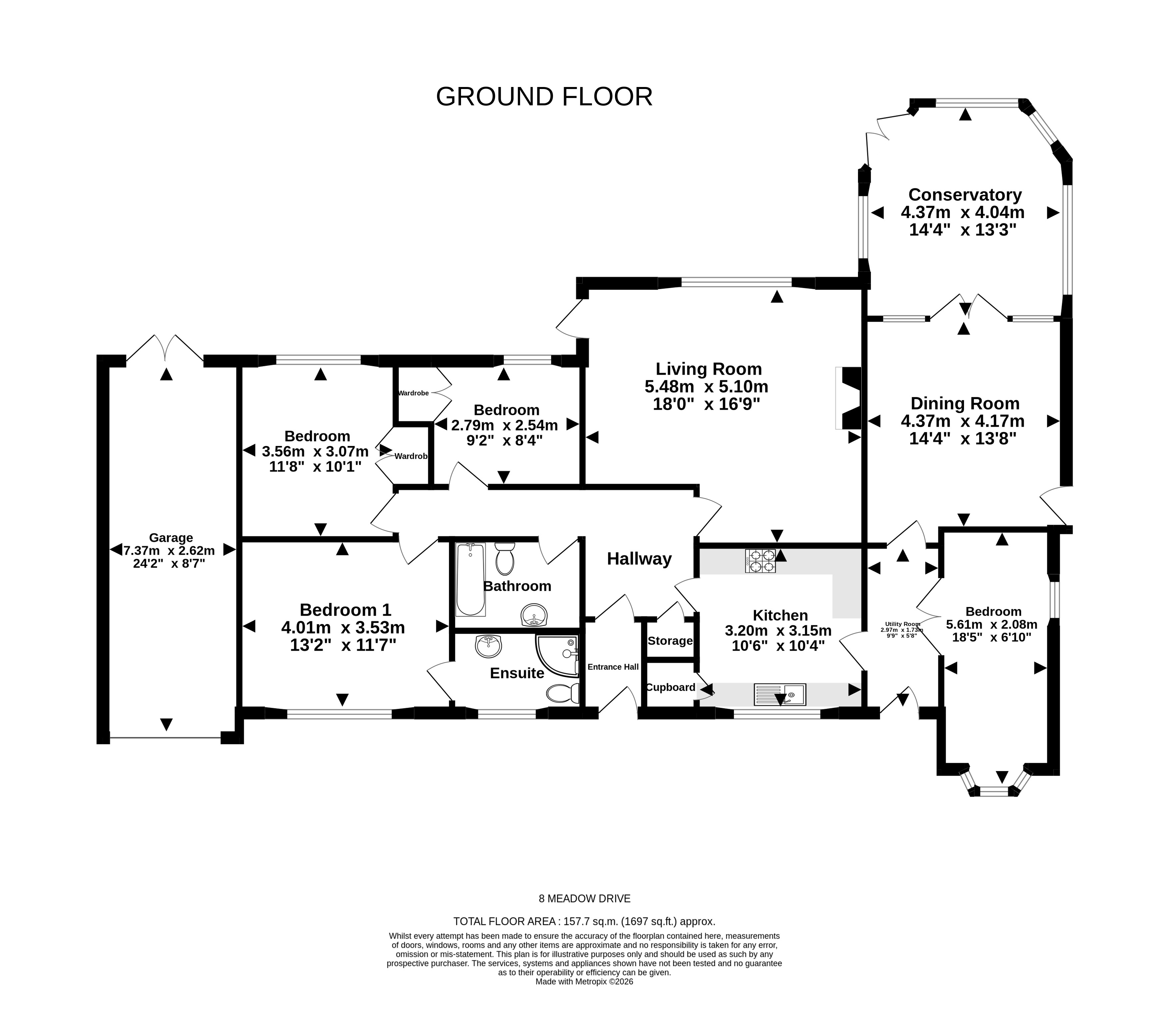 This home offers plenty of versatile living accommodation, so can be easily arranged for a wide range of buyers. The bungalow has 3 spacious reception rooms, currently laid out as a living room overlooking the rear garden, dining room and a beautiful conservatory. There is a fitted kitchen with double oven, hob, with space for appliances. The 4 bedrooms are good sizes, 3 have fitted wardrobes and the master has a beautiful modern shower room. A luxury 3-piece family bathroom suite is located off the hallway, along with a storage cupboard.