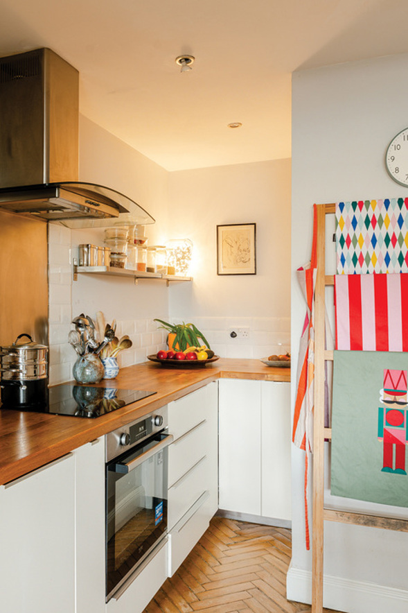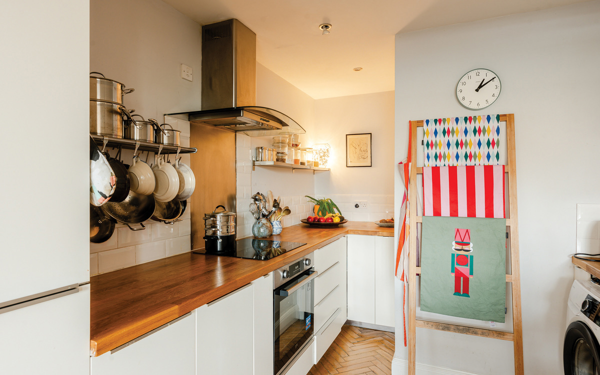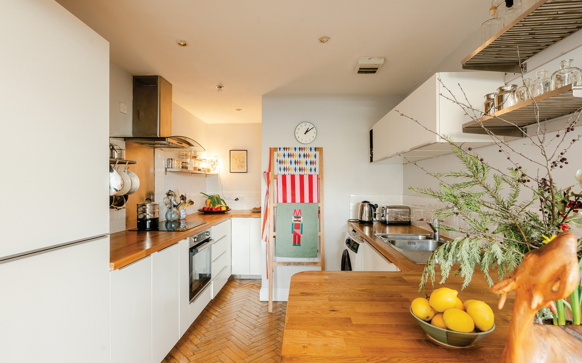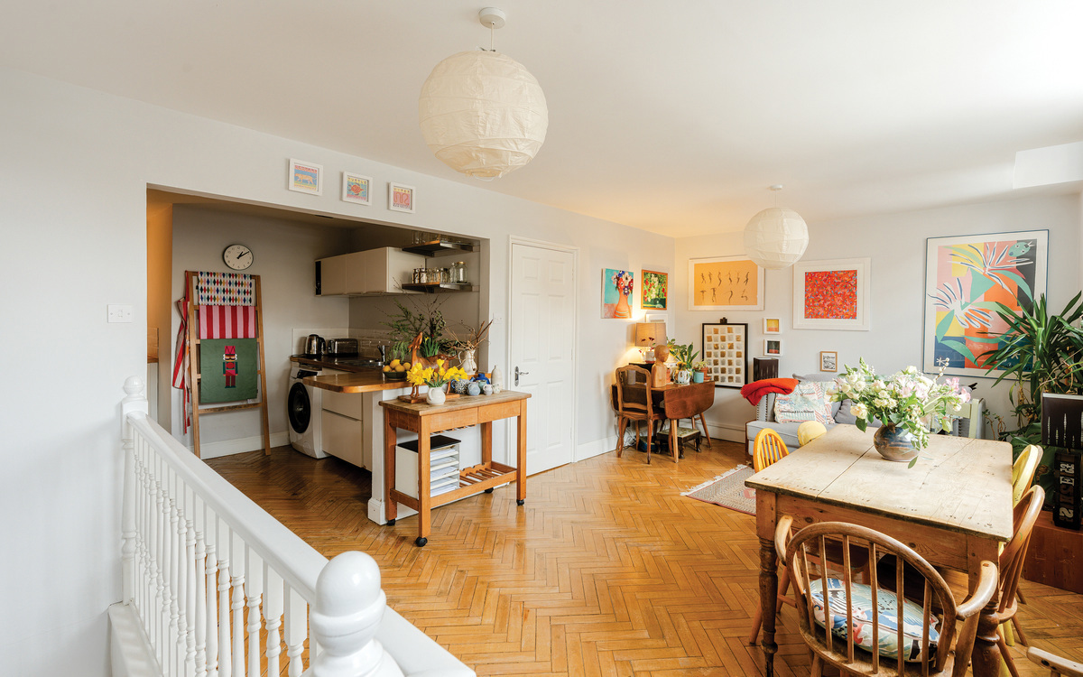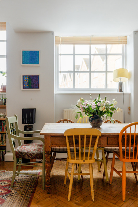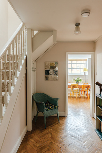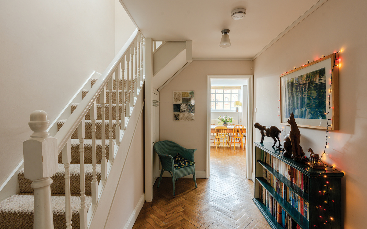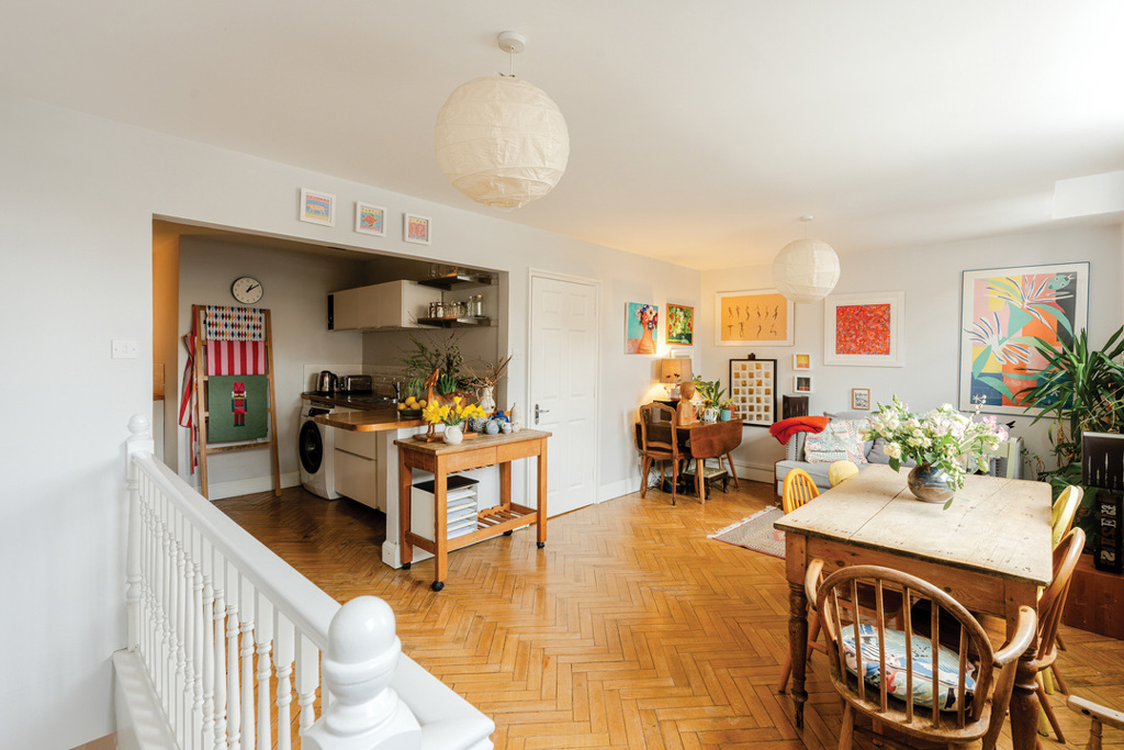 Enjoying around 120m2 of space over three floors, there is plenty of room to suit a variety of prospective owners. On the ground floor, there is a spacious entrance hallway with a WC with the main living space at the end. Three windows bring natural light into what is currently a dining/sitting room, and also into the kitchen which is connected to the rest of the space through an opening. The kitchen itself features ample cupboard and counter space, an integrated fridge/freezer, dishwasher and oven/hob, as well as room for a washing machine. The original parquet flooring running throughout the ground floor is gorgeous and a nod to the buildings' past.
