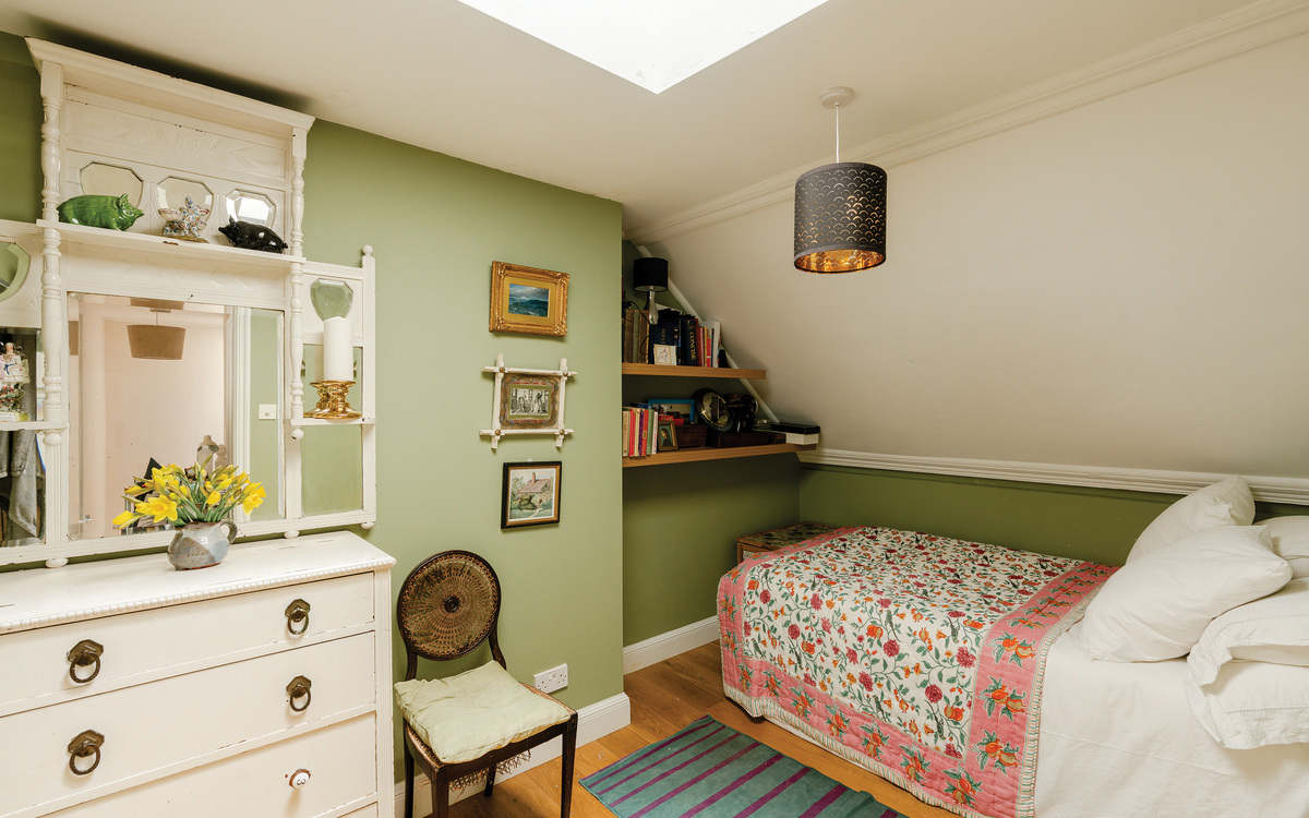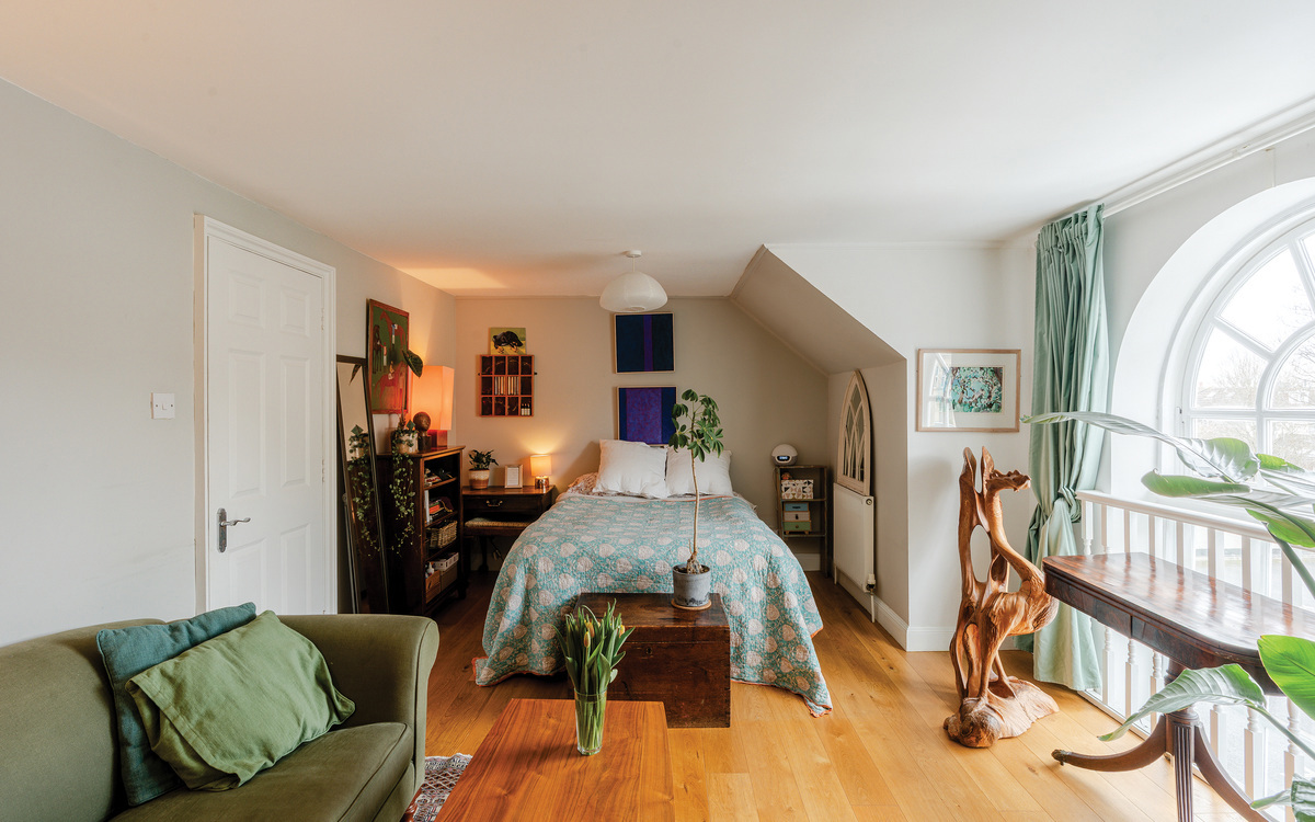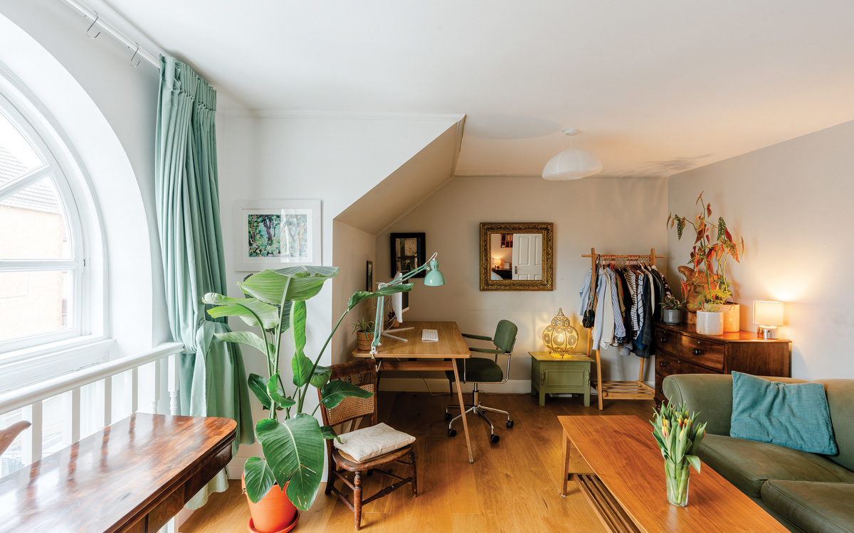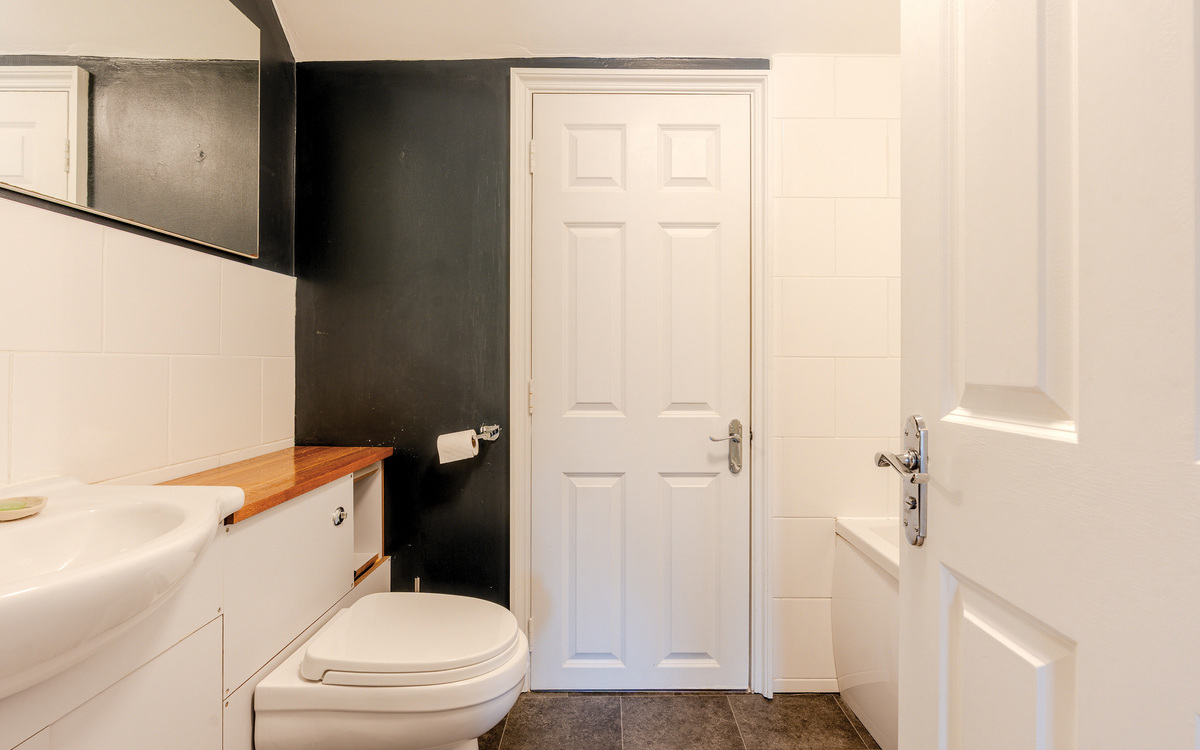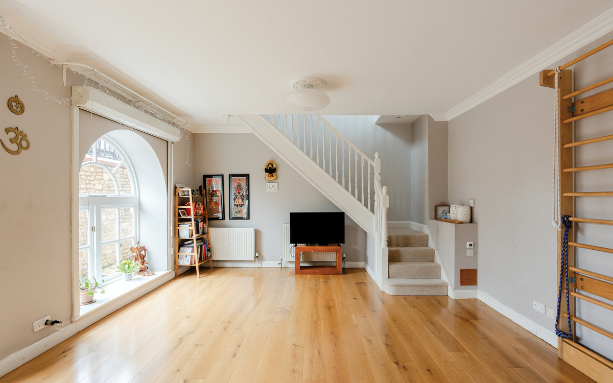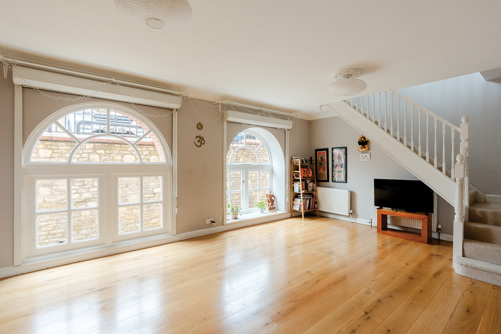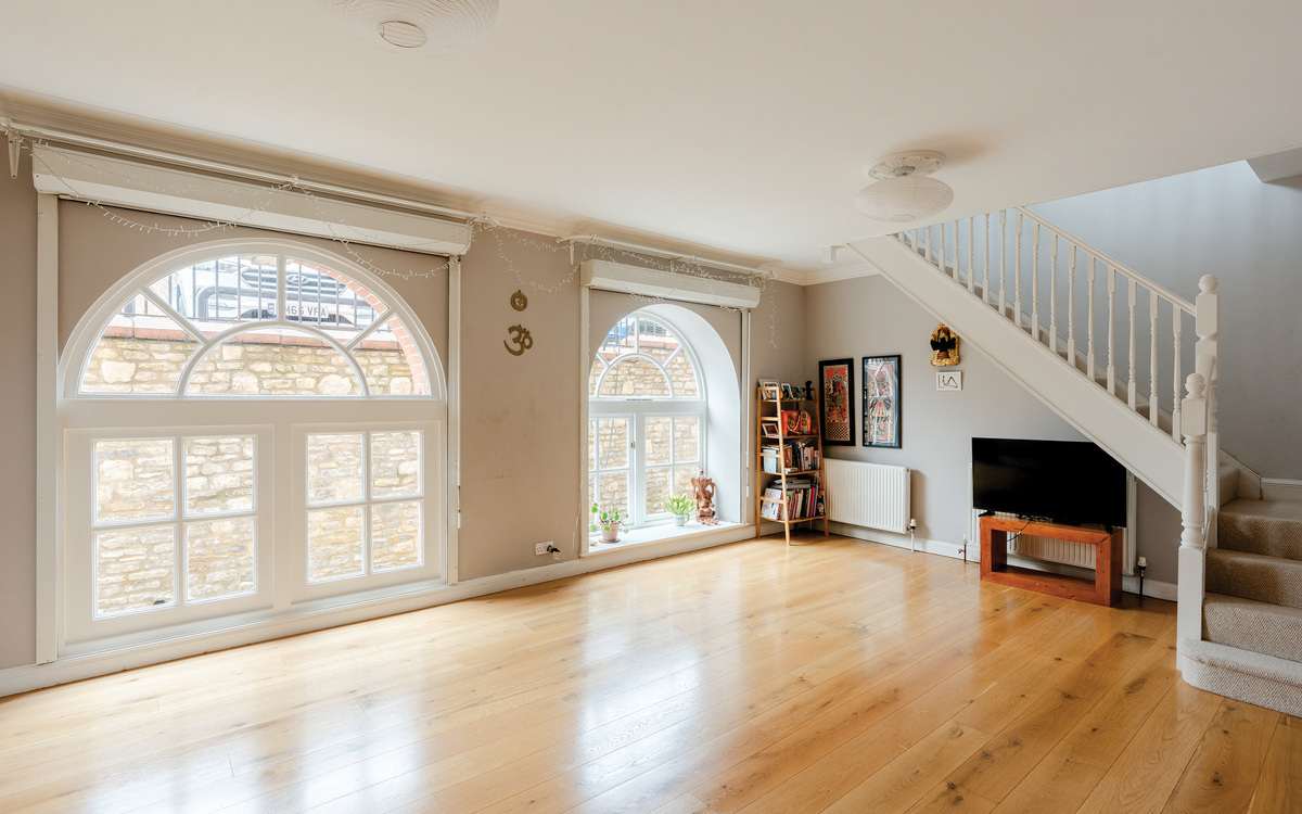 The upper floor has the two bedrooms, both of which are doubles, and the main bathroom. The primary bedroom is an excellent size, spanning the width of the property and enjoying one of the same arching feature windows as the living / studio space and with more than enough room for bedroom furniture essentials. The second bedroom is a smaller double but still adequately roomy for use as a guest room or for a child or lodger while the bathroom, as well as having a white suite with a shower over the bath, has access to a large storage cupboard. Loft storage is also available off the landing.