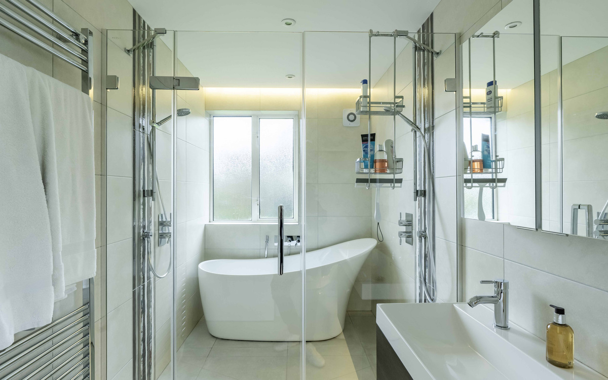 - Unusually styled bathroom with two showers and slipper bath