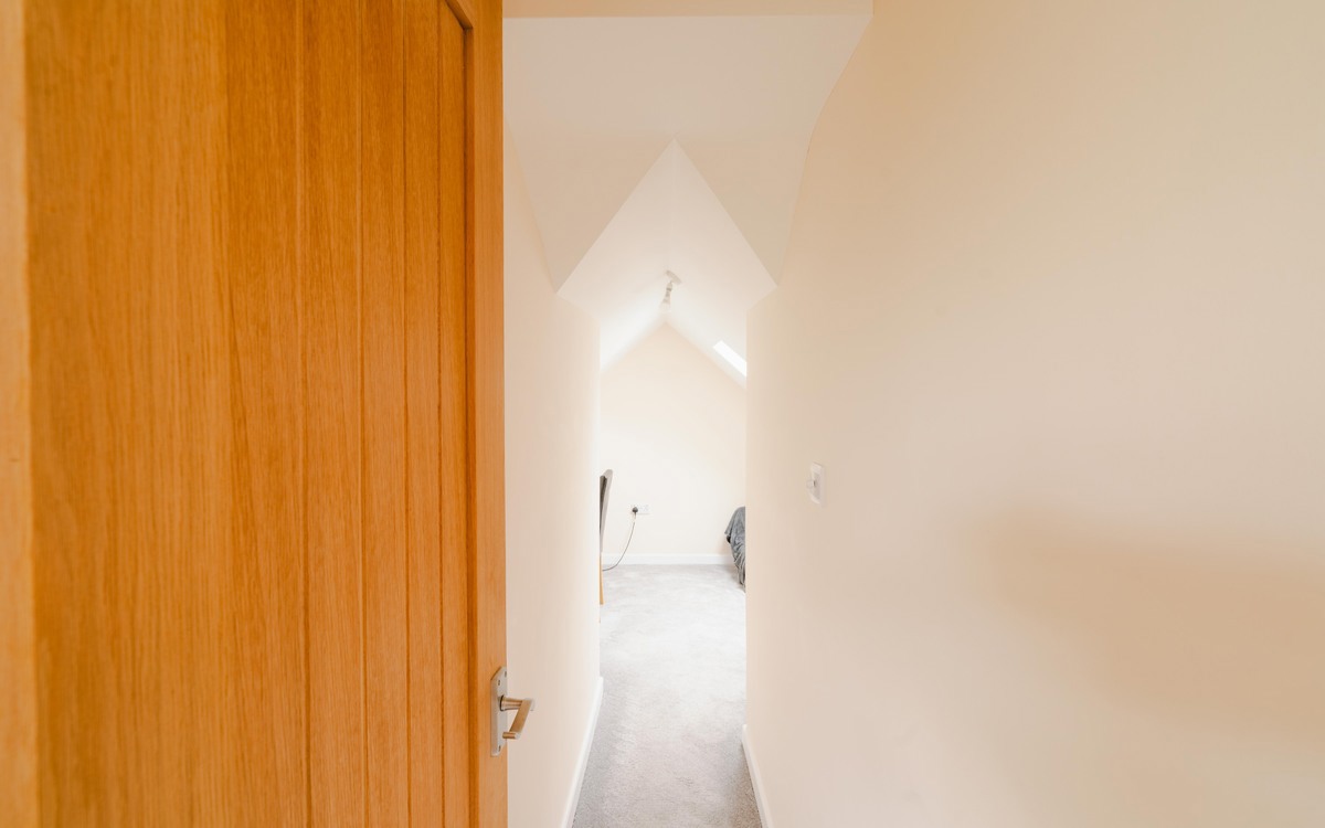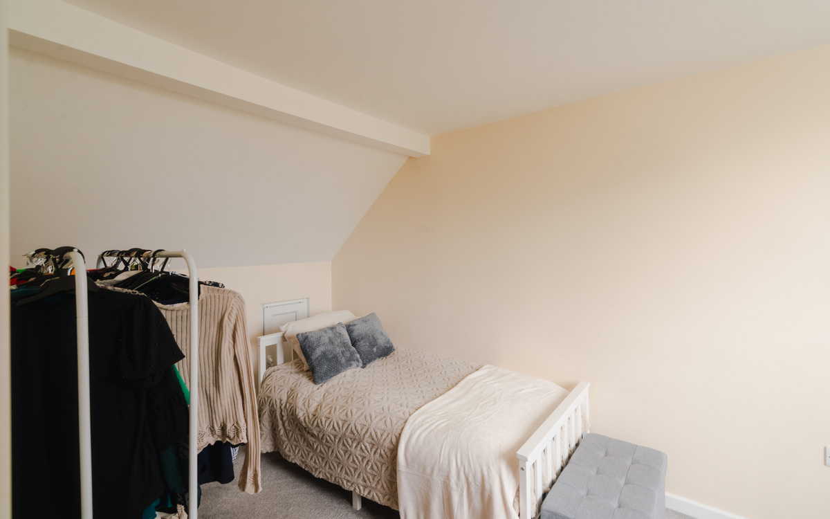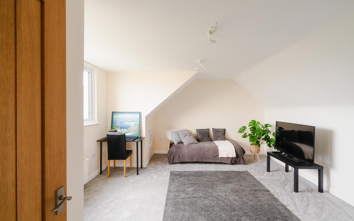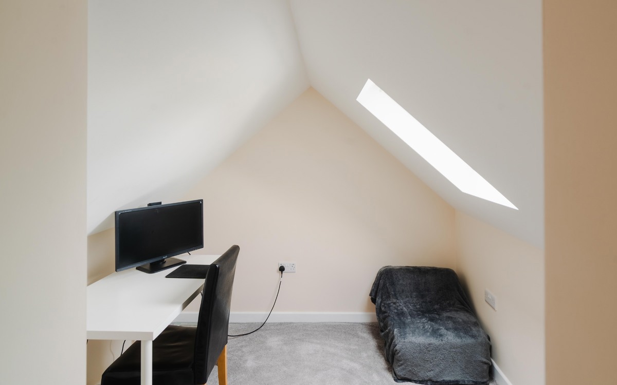 Upon stepping through the porch, you are welcomed by a generous entrance hall that leads to a spacious lounge area, two double bedrooms, a family bathroom, and an open plan kitchen/diner. The kitchen boasts sleek gloss units and ample workspace for meal preparation. Ascending the stairs, two more double bedrooms with eave storage, a study, and a shower room await. This versatile home has been thoughtfully designed to cater to all kinds of individuals.