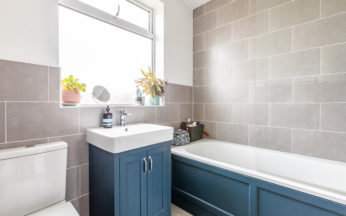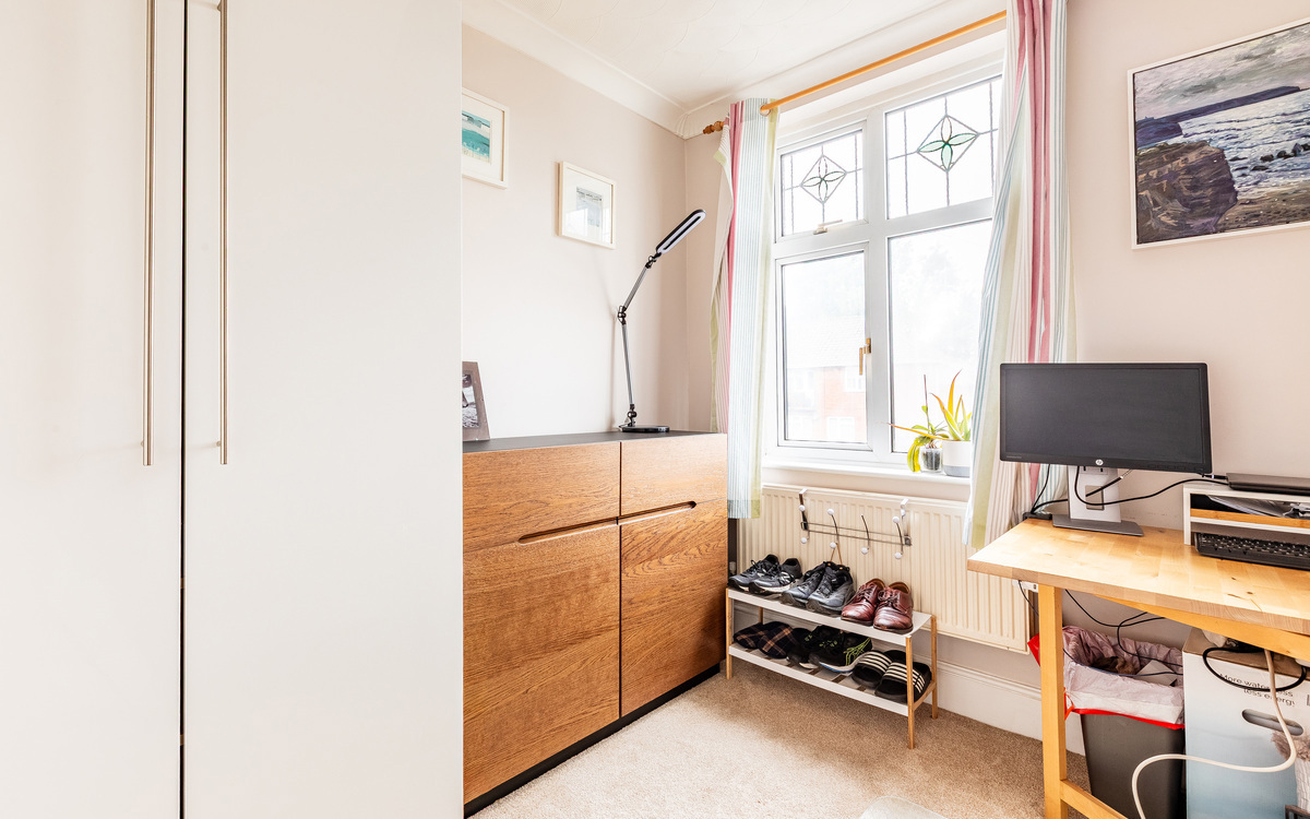 Upstairs are three bedrooms, two large doubles and a good sized single, and the main bathroom. The double at the front benefits from a bay window, while the other overlooks the garden. The single bedroom makes an ideal room for a child or a home office, depending on need. The bathroom, recently and tastefully upgraded, has a white suite with a shower over the bath.