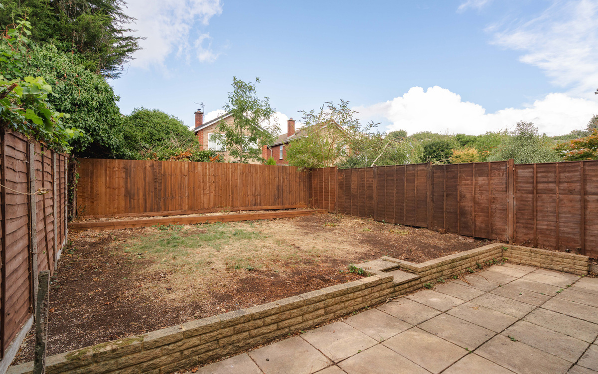 Enclosed by fencing, there is a patio space next to the house with the main area of the garden laid to lawn.