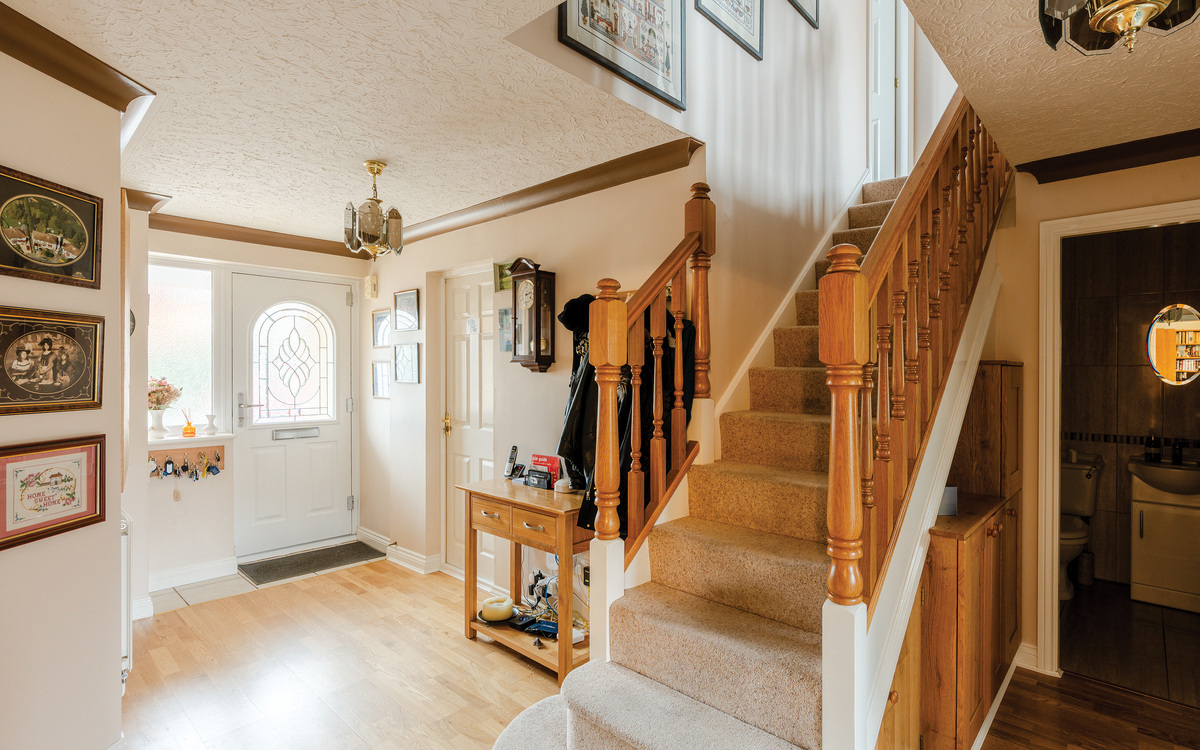 The property is approached via a block-paved driveway providing ample parking for multiple vehicles, leading to a double garage with power, lighting and water supply. A contemporary composite front door opens into a spacious entrance hall featuring real wood flooring, bespoke storage cupboards and solid oak staircase balustrades, immediately setting the tone for the quality found throughout.