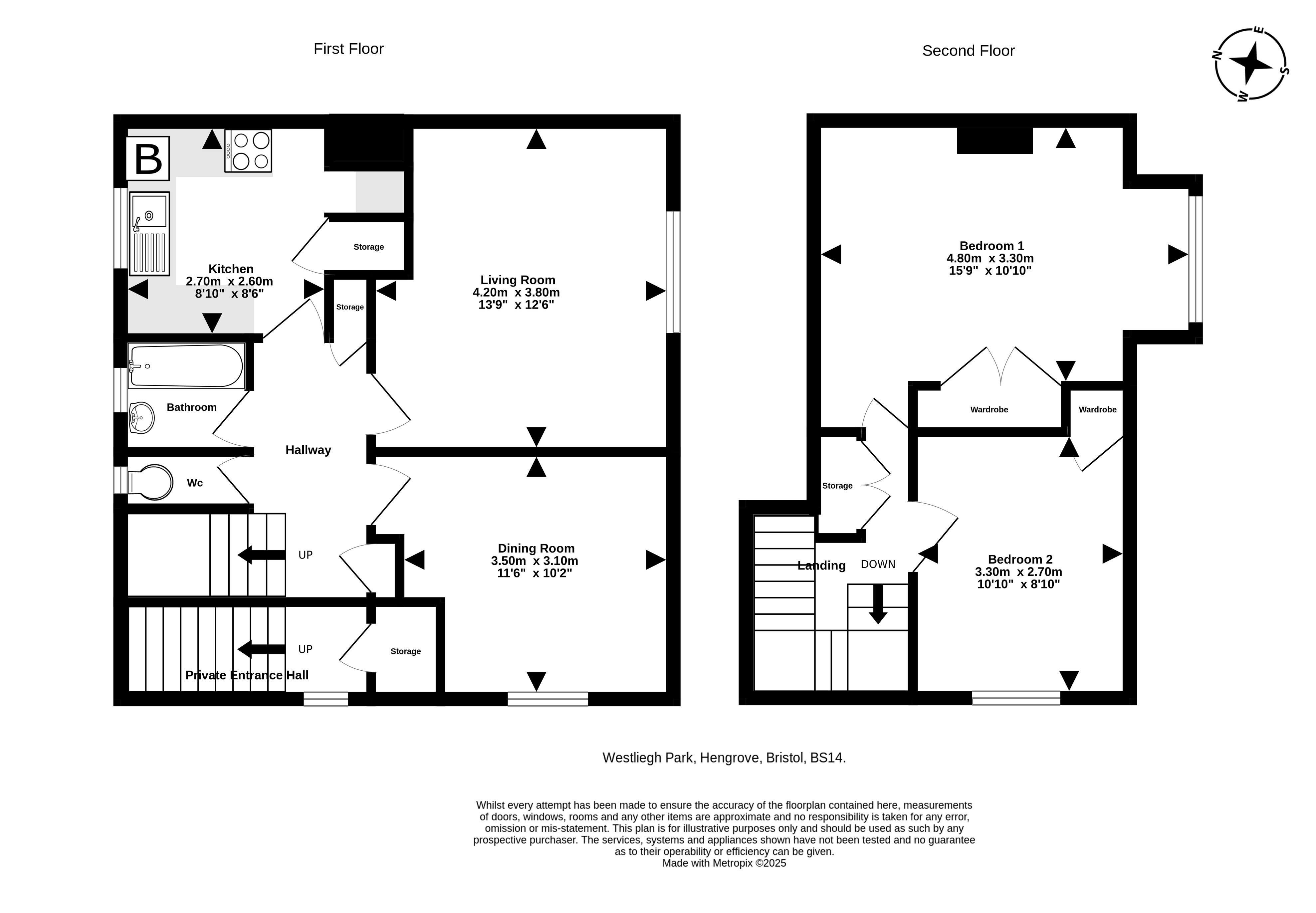 The first floor is accessed via a private hallway and features the main living areas, including a spacious living room, a dining room, and a separate kitchen. This level also includes a bathroom and a separate WC. Upstairs are two double bedrooms, each with built-in wardrobes. Throughout the property, there is ample storage space.