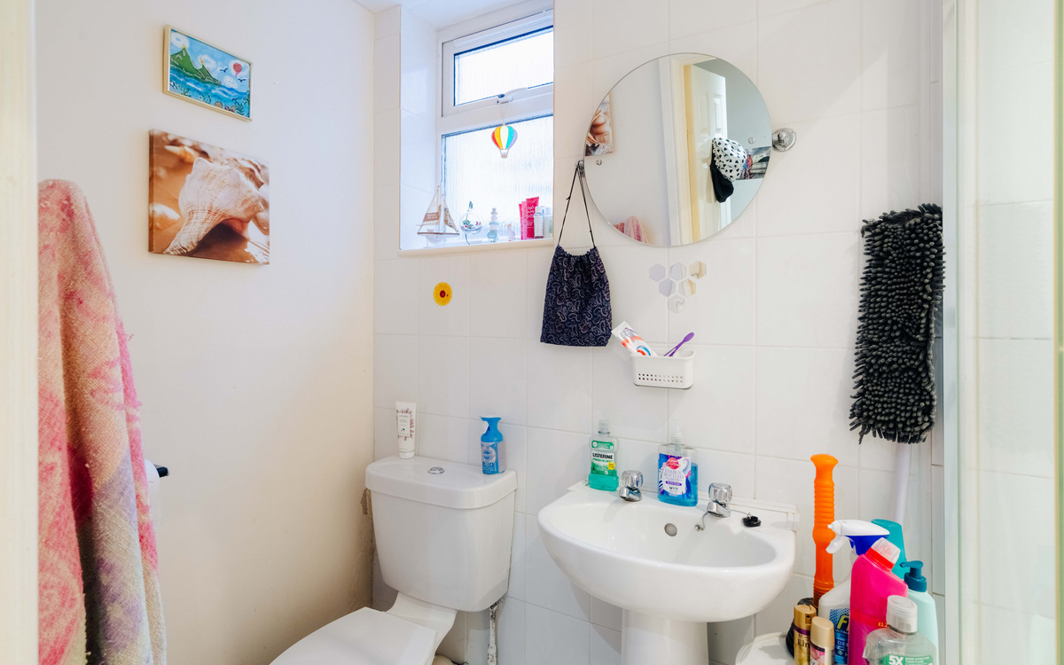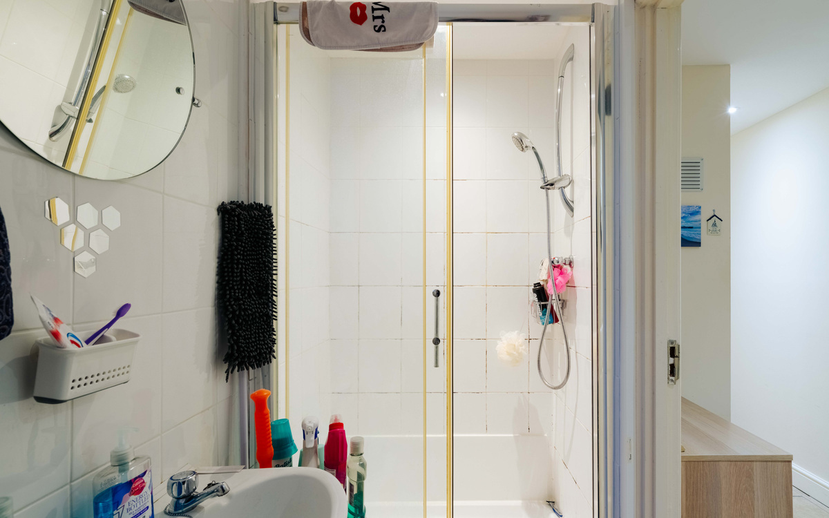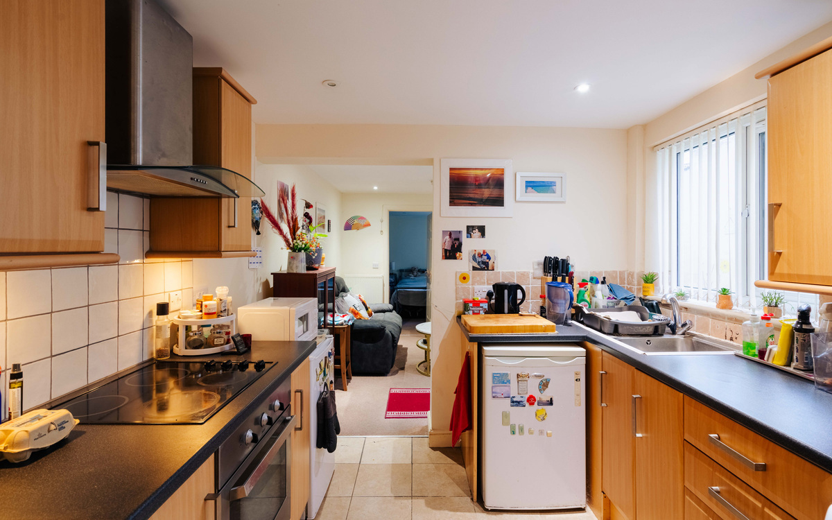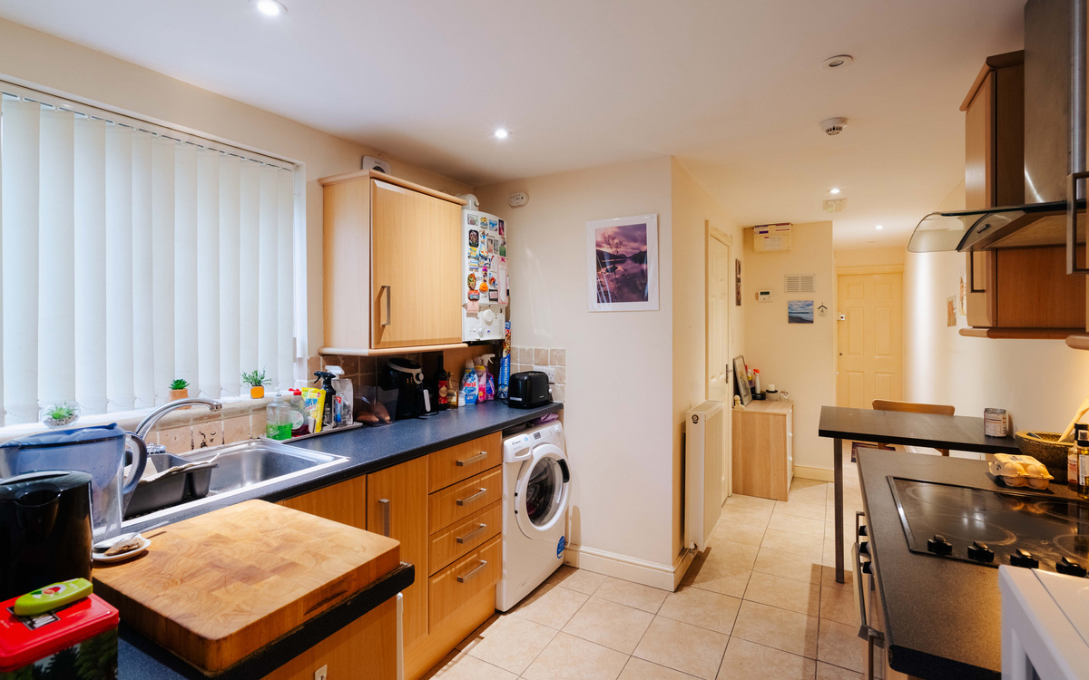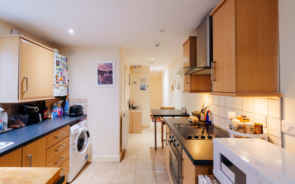 On the ground floor of the building, inside the flat and at the end of the hallway is the kitchen which has a good amount of cupboard and counter space, an integrated electric oven and hob and spaces for a fridge and washer/dryer. There is also room for a dining table. The living room has a cosy feel and also provides access to the courtyard garden. Beyond the living room is the bedroom, a good sized double with space enough for all the essentials while the shower room has a white suite including a walk-in shower.