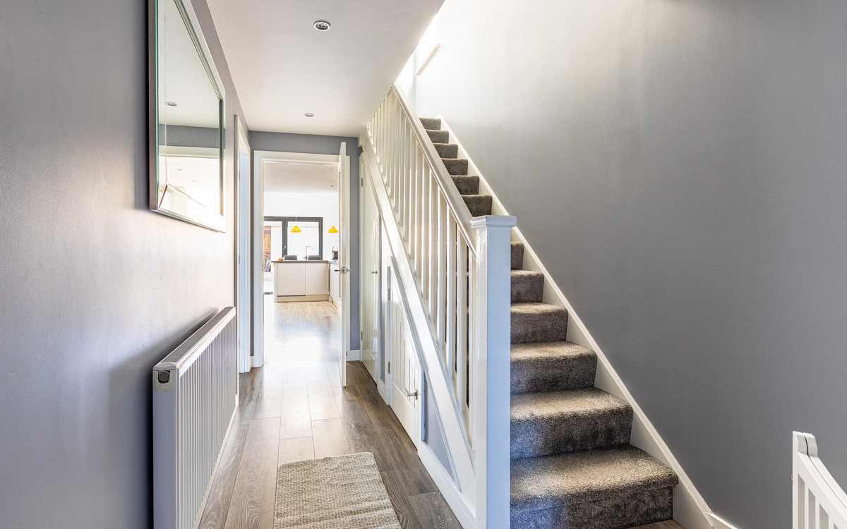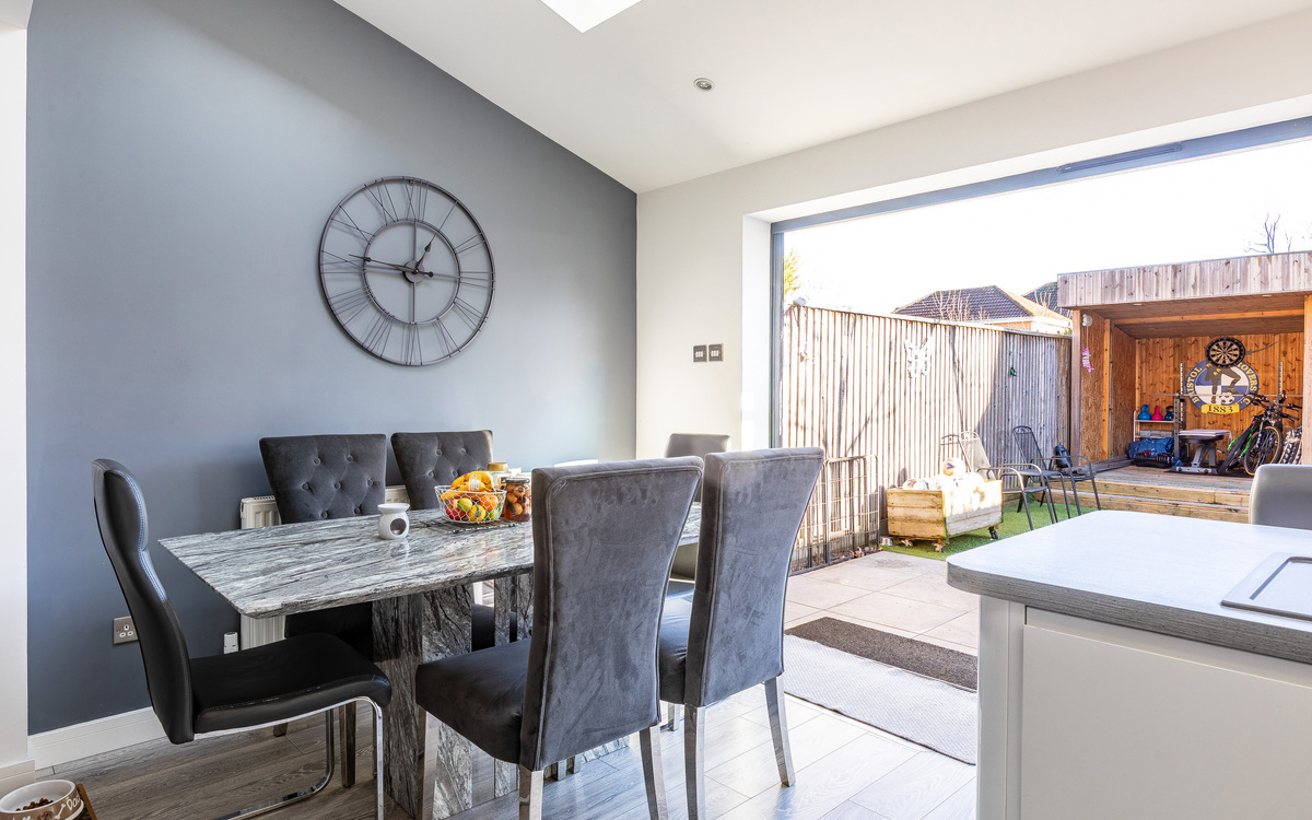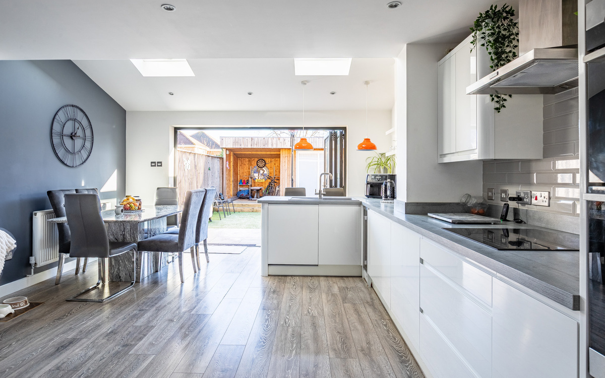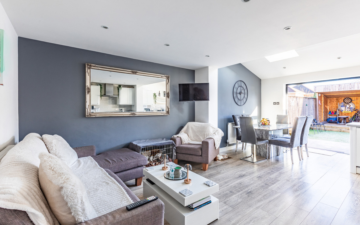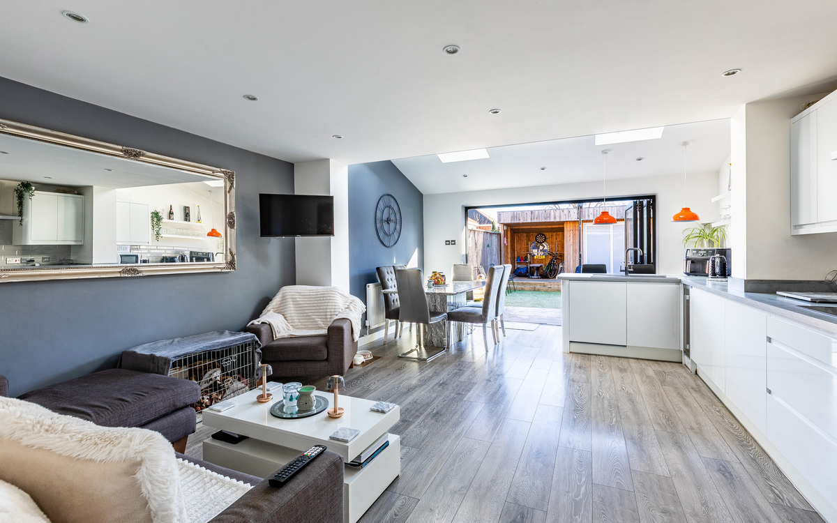 Upon entering the home, you are welcomed into an entrance hall that leads through the entire ground floor. To the left is a sizeable lounge featuring a bay window, while to the rear of the property and arguably the home’s main attraction, is the extended open-plan kitchen/dining/living area. This impressive space benefits from two large Velux windows, allowing natura...
