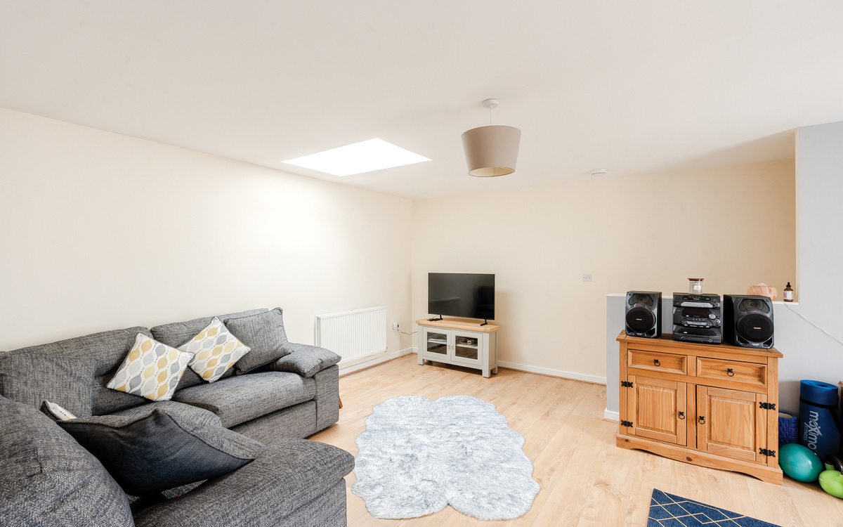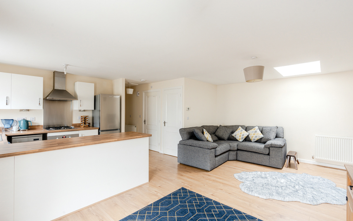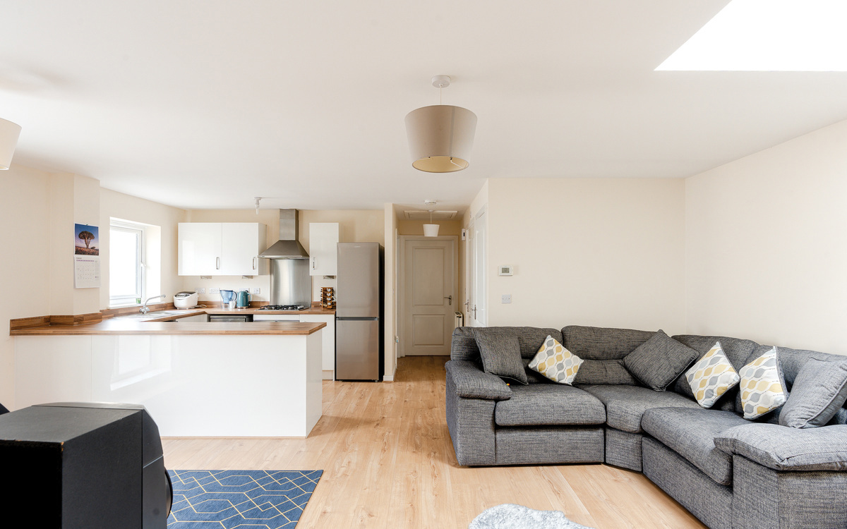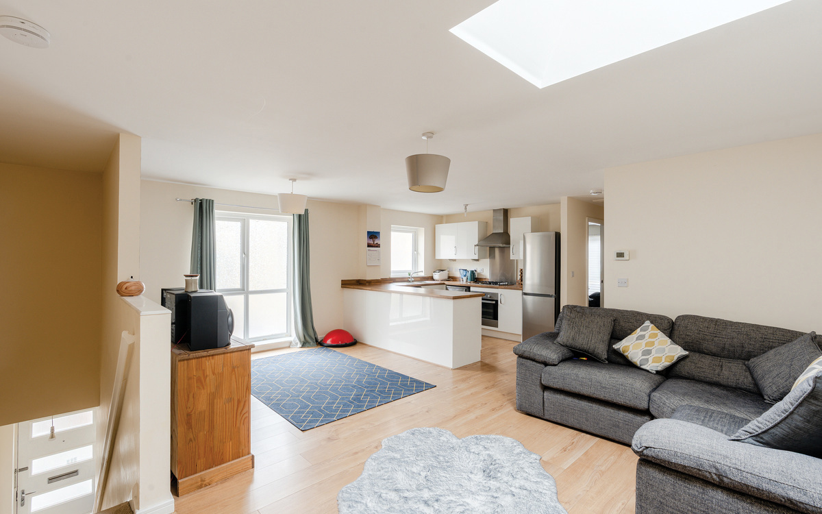 The accommodation is spacious and naturally light, which is complemented by modern decor. On entering the property, you will find a hallway with stairs that take you up to the open-plan lounge and kitchen/diner area, with a lovely skylight. There are 2 spacious double bedrooms and a family bathroom. In addition, the home benefits from gas central heating, a well-proportioned garage, double-glazed windows, and all the perks of a high-energy efficiency home due to its modern construction.