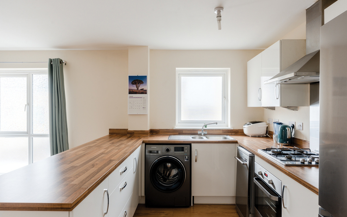 A stylish two-double-bedroom freehold coach-house with a spacious garage, offering modern decor throughout, open-plan living and allocated parking.