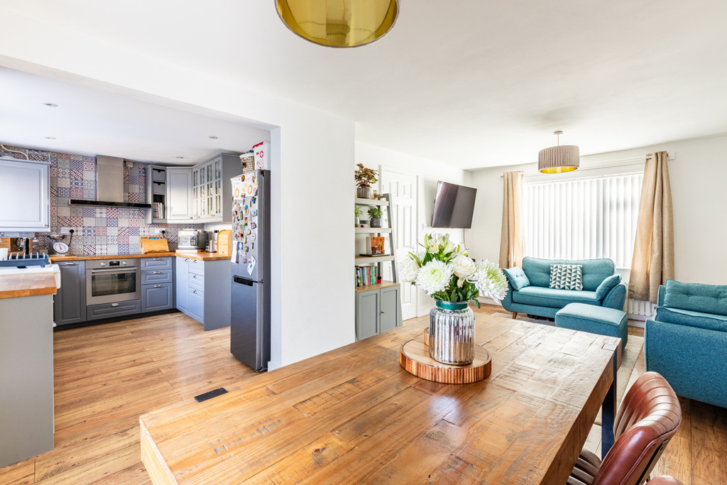 This beautifully presented 3-bedroom house with open- plan living space and a popular location. The front door leads to a spacious entrance hall, open-plan lounge/dining room, fitted kitchen, downstairs cloakroom and stairs to the first floor. The first- floor landing is light and airy with doors to the three generous bedrooms and a beautifully presented bathroom with rolled top bath and a separate shower cubicle. The house boasts gas central heating, double glazing, gardens, a shed to the side and parking in the communal parking area.