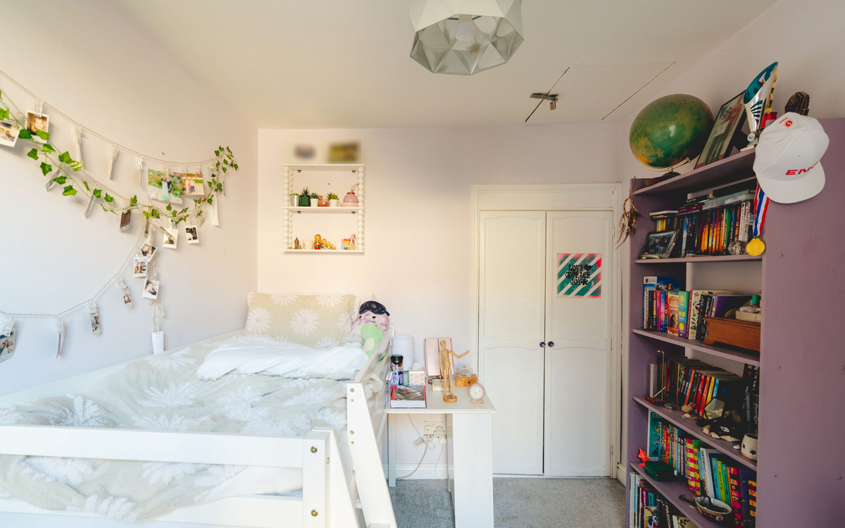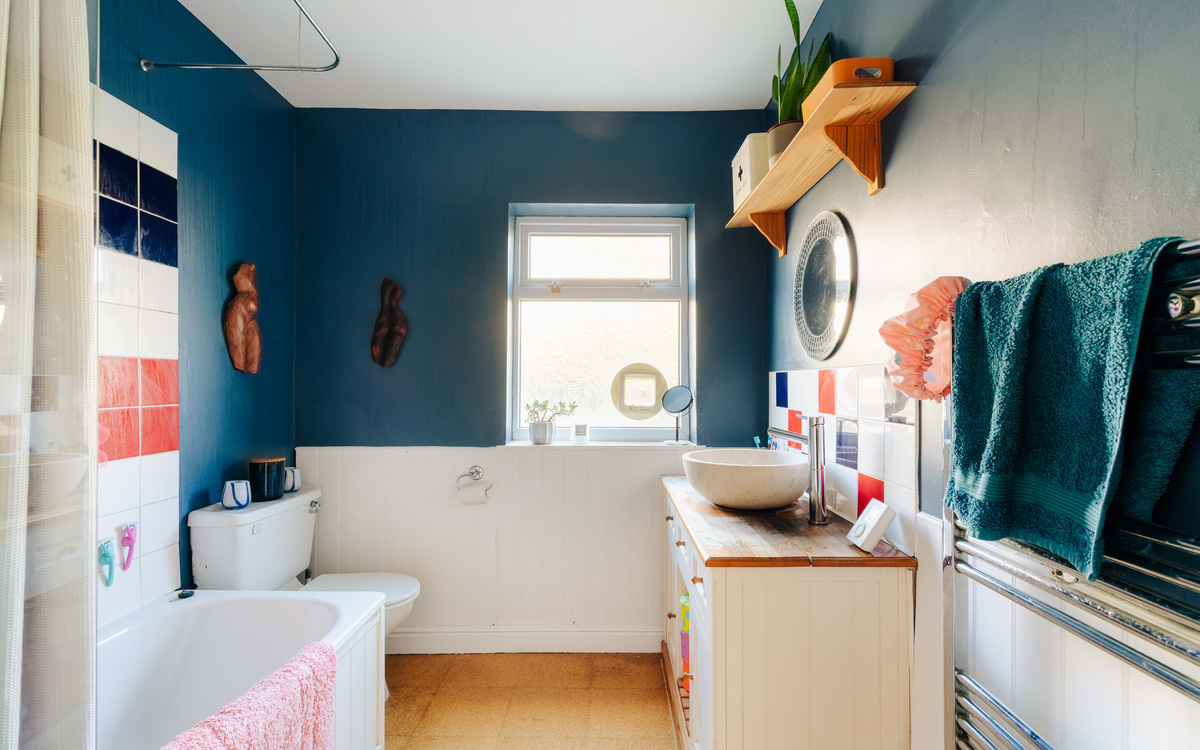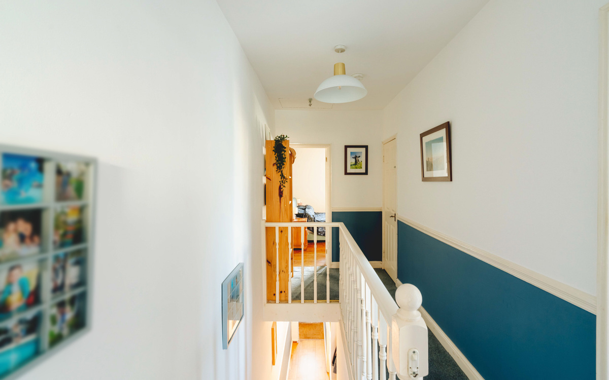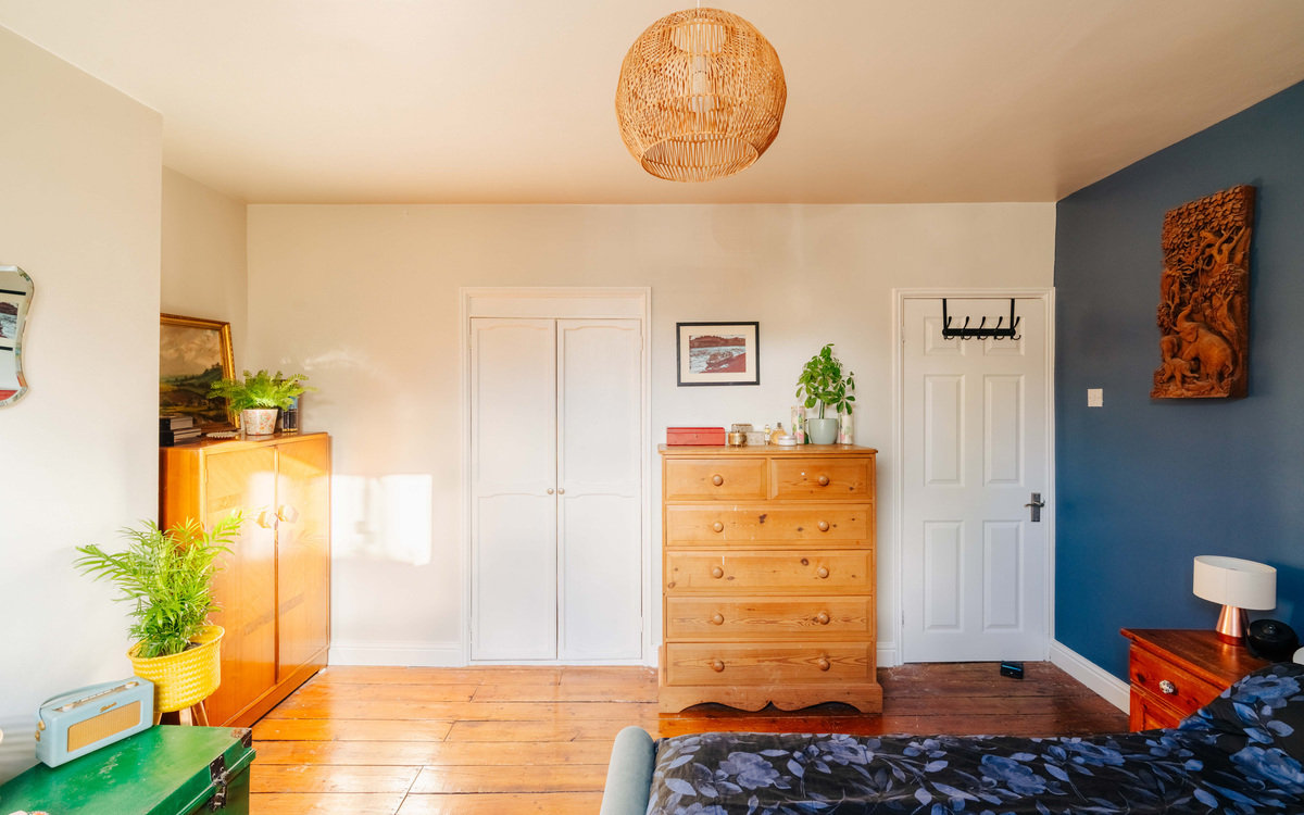Upstairs, the property continues to impress with two good-sized bedrooms, each benefitting from cleverly incorporated Jack-and-Jill style storage cupboards. The main bedroom features attractive stripped floorboards, which really enhance the home’s traditional feel. The family bathroom is generously proportioned and finished in calming deep blue tones, creating a relaxing space to unwind.