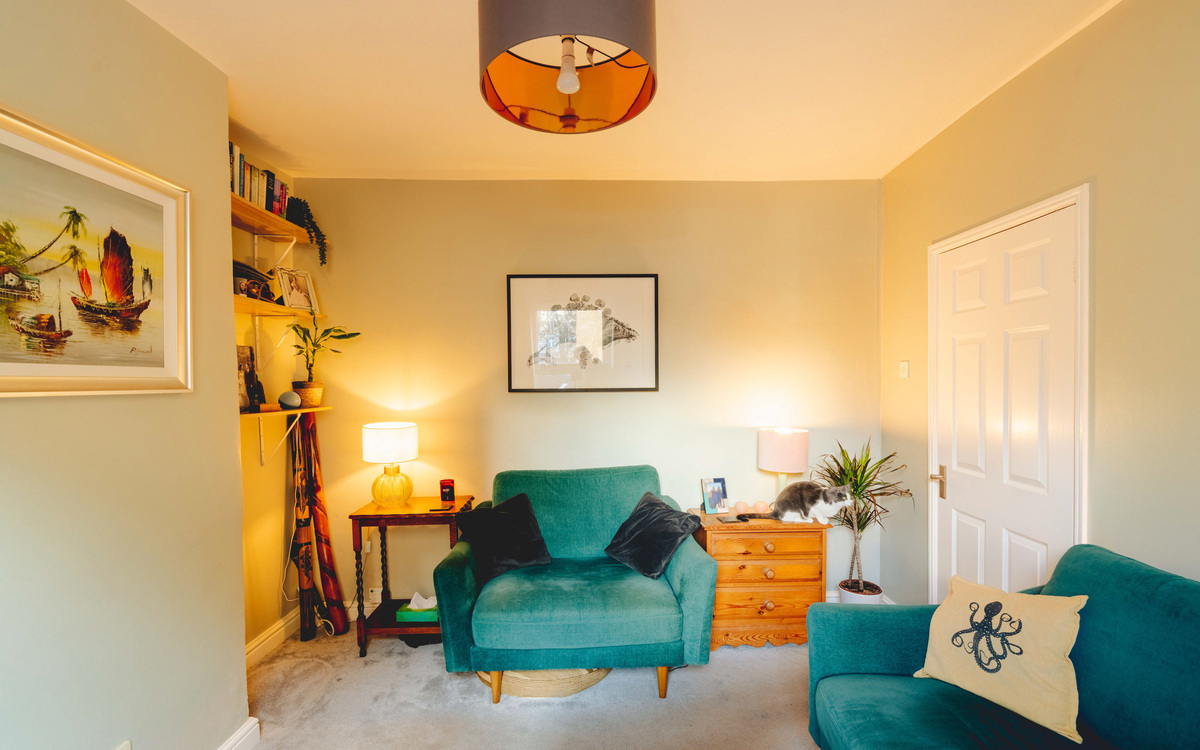 You’re greeted by a pleasant entrance hall with doors leading through to the main living areas. The lounge is a cosy snug, beautifully finished with rich French green walls that contrast elegantly against the light grey carpet. Smart, built-in shelving within the recesses provides the perfect spot for books, artwork, or personal touches, adding both style and practicality.