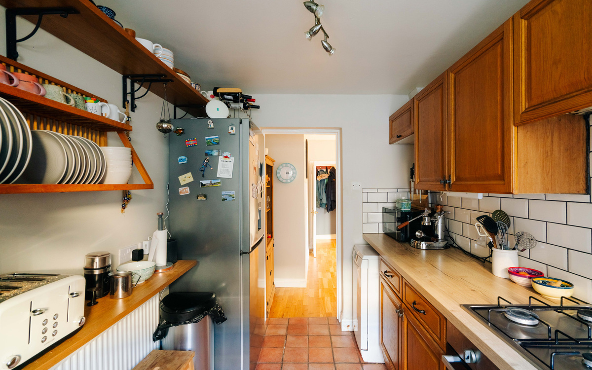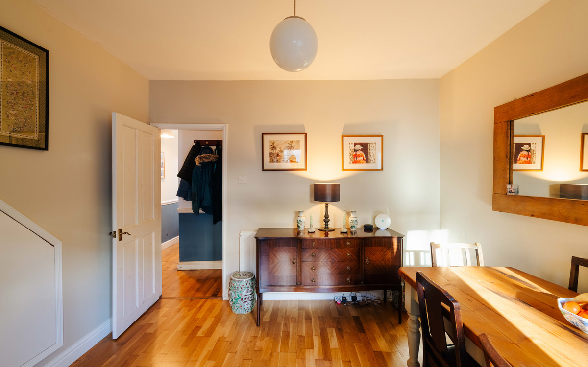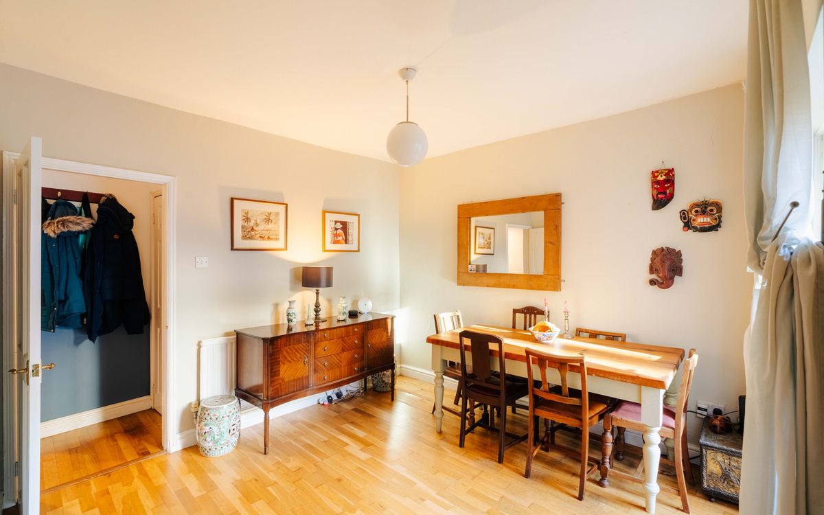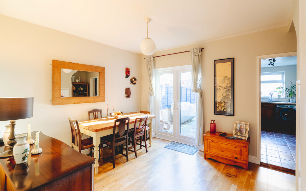 The dining room is a lovely, sociable space, filled with natural light thanks to French doors that open directly onto the rear garden. From here, the room flows seamlessly into the traditional galley-style kitchen, making it ideal for both everyday living and entertaining.