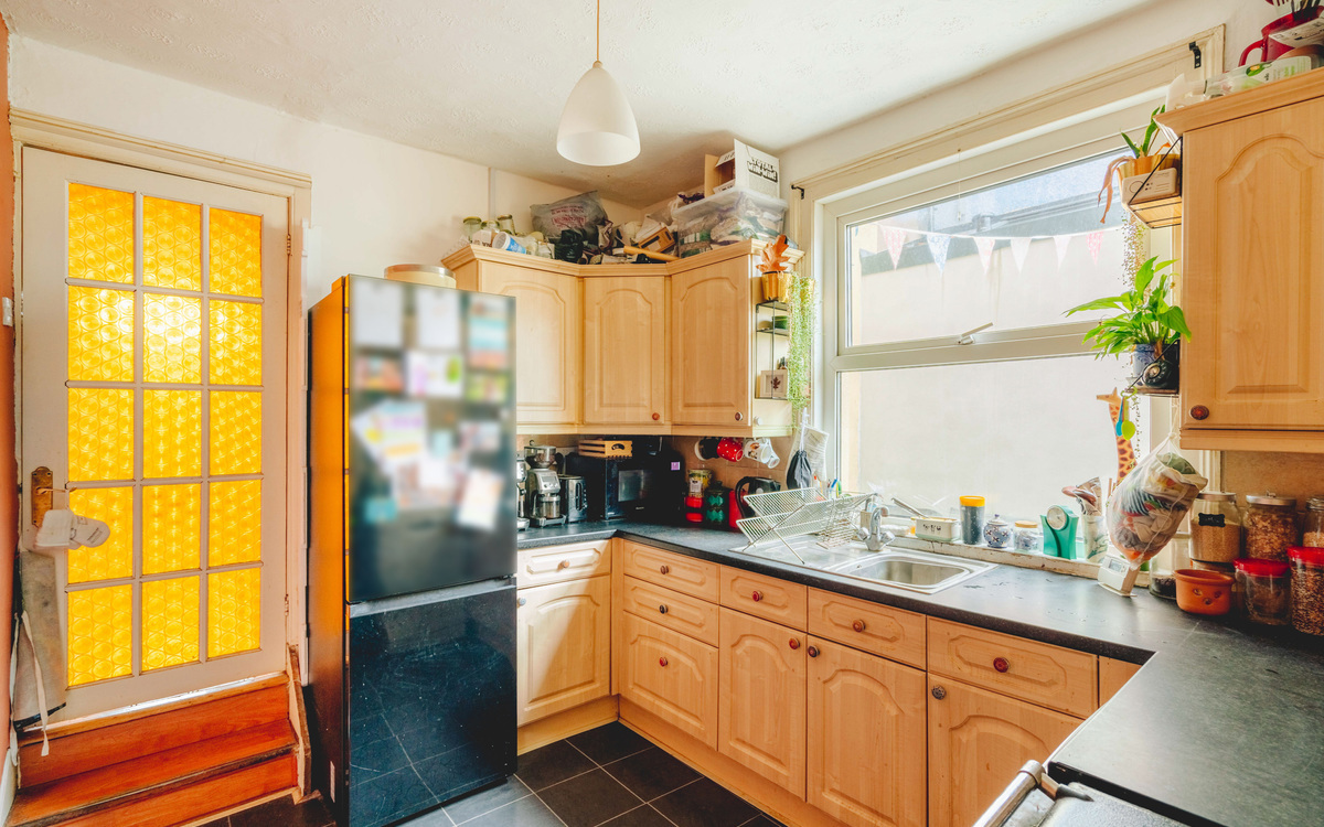 Stepping down from the dining room, the kitchen remains a good size and offers excellent potential. The current owners have intentionally left this space ready for a prospective buyer to modernise or redesign to suit their own taste and lifestyle. Beyond the kitchen is a useful lobby area with a door providing direct access to the garden. This area also leads to the bathroom, which is well-proportioned and has been refurbished by the current owners, featuring a handy built-in storage cupboard for added practicality.