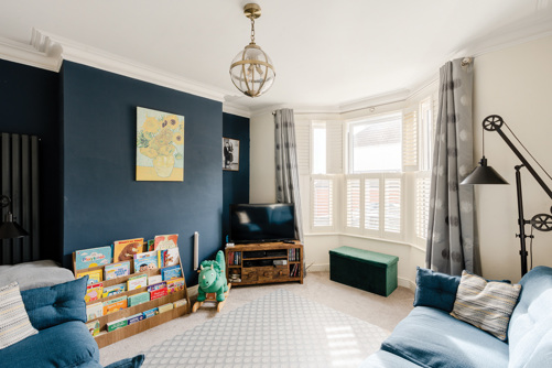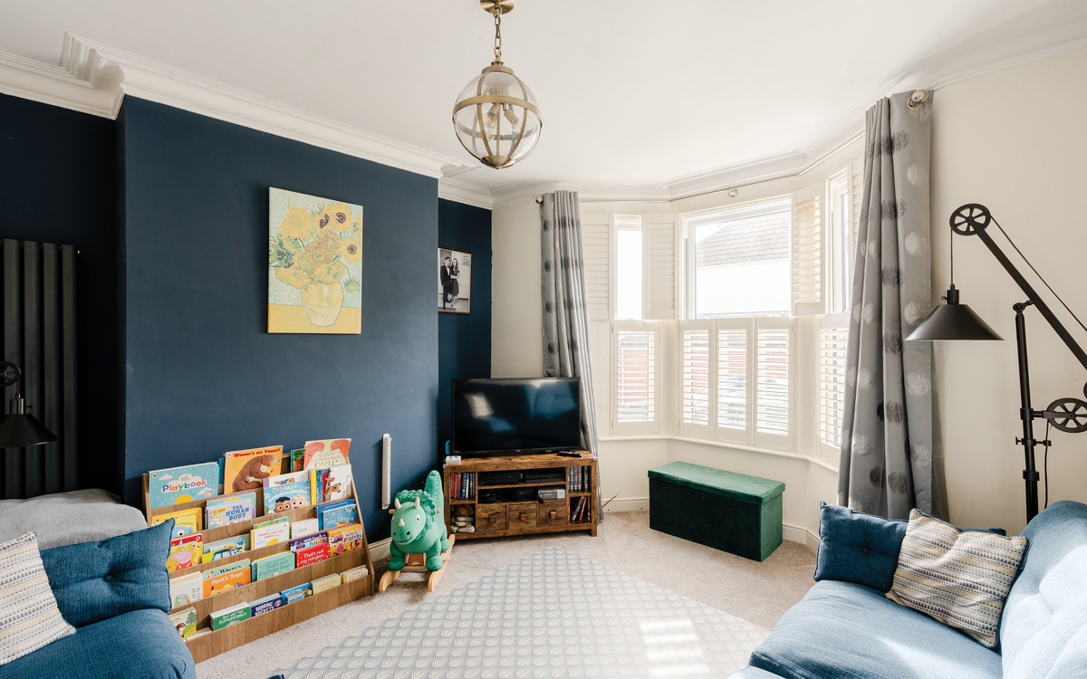 The front room boasts a striking navy feature wall, centred around a generous bay window with attractive French shutters that fill the room with natural light. The impressively extended kitchen/diner occupies the rear elevation. At the front of this beautifully designed space is a welcoming seating nook, complete with a characterful log burner. Flowing seamlessly be...