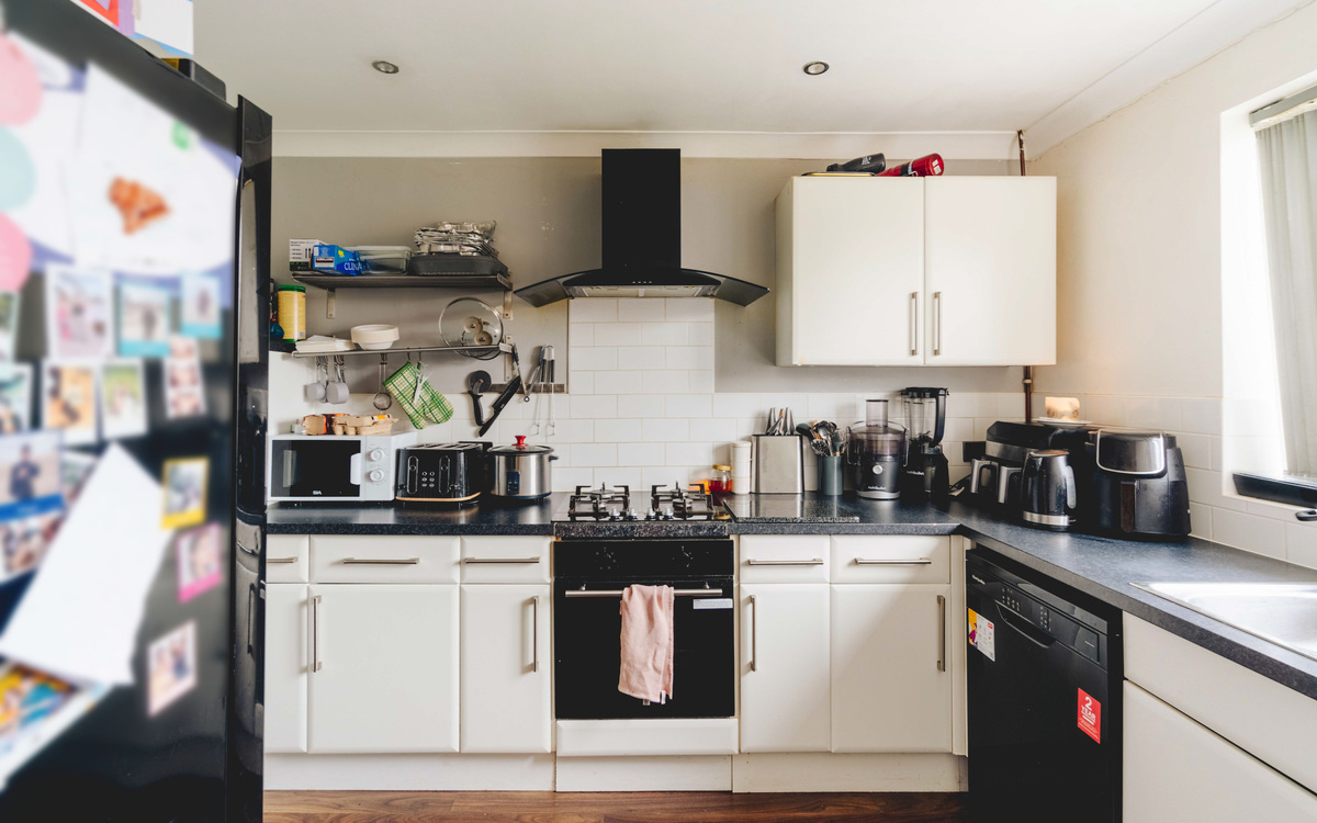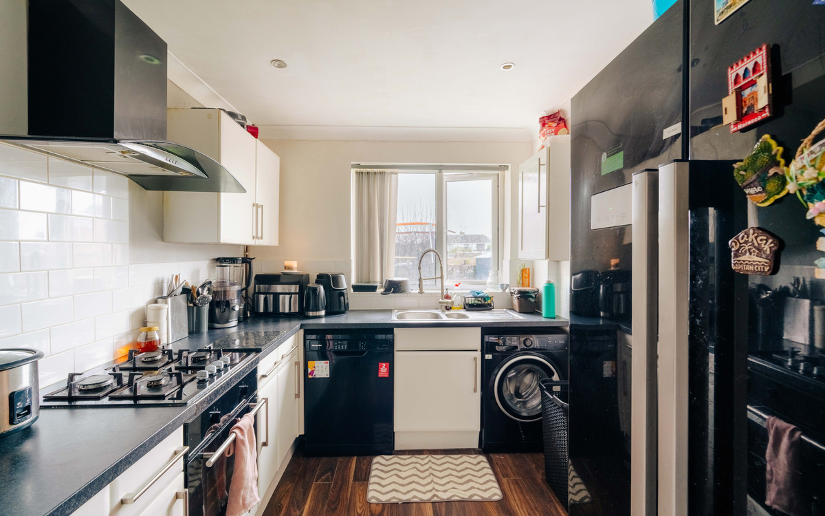 The ground floor feels spacious with the living and dining rooms connected through an opening, allowing for light to come in through both the window at the front and the patio doors on to the garden, as well as offering some flexibility in how the space is used. The kitchen is accessed from the dining room space and has ample cupboard and counter space, as well as space...
