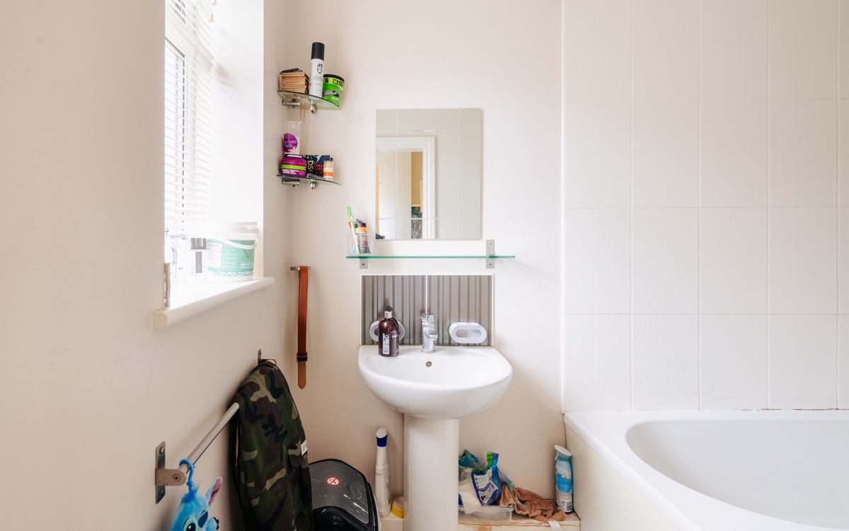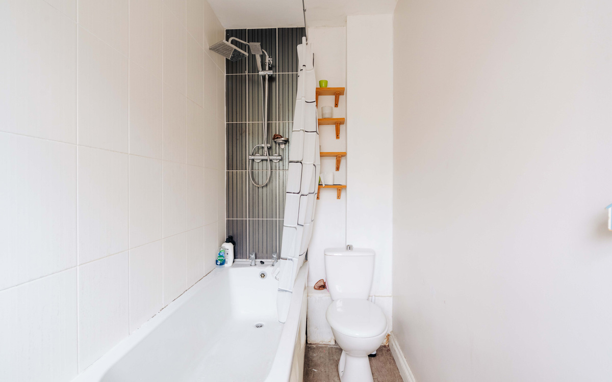 The ground floor feels spacious with the living and dining rooms connected through an opening, allowing for light to come in through both the window at the front and the patio doors on to the garden, as well as offering some flexibility in how the space is used. The kitchen is accessed from the dining room space and has ample cupboard and counter space, as well as spaces for the essential appliances. Additionally, there is a bathroom off the hallway which has a white suite with a shower over the bath.