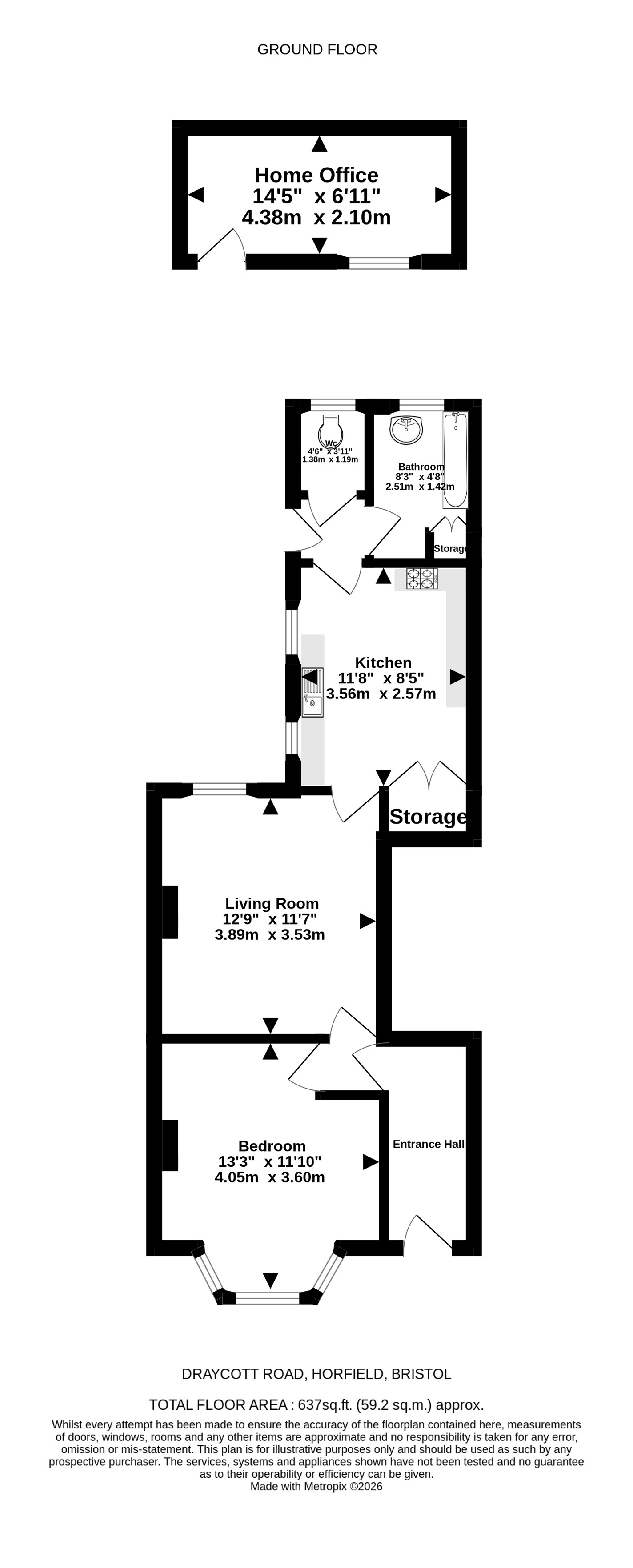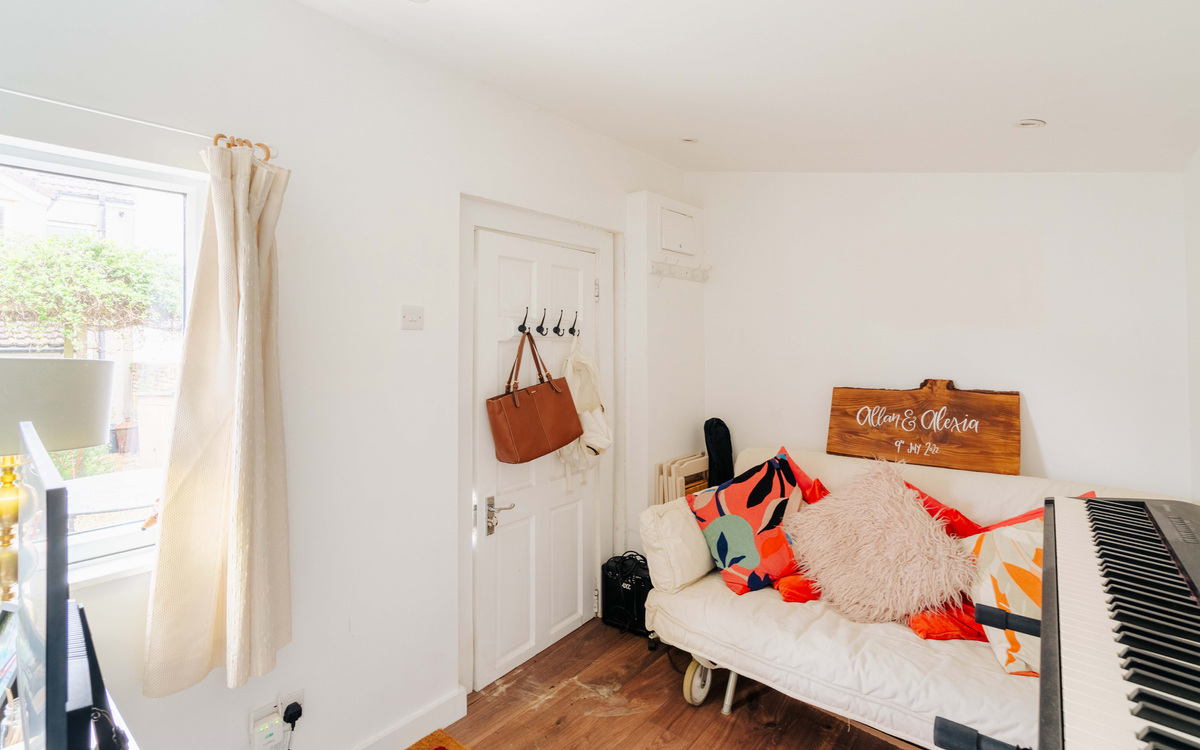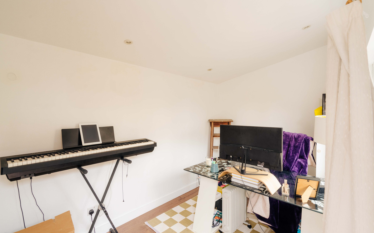 The home is well-presented throughout, offering a modern and fresh feel from the moment you step inside. A well-kept communal entrance leads into the property’s welcoming hallway. At the front of the home, the bay-fronted principal bedroom enjoys plenty of natural light and benefits from sleek storage fitted neatly into the alcoves. The living room is contemporary and inviting, complete with stylish built-in shelving that enhances the clean, minimalist design. To the rear, the layout flows effortlessly into a well-appointed kitchen and bathroom with a separate WC, creating a practical yet polished living space perfectly suited to today’s lifestyle. A home office at the rear of the garden completes the plan.