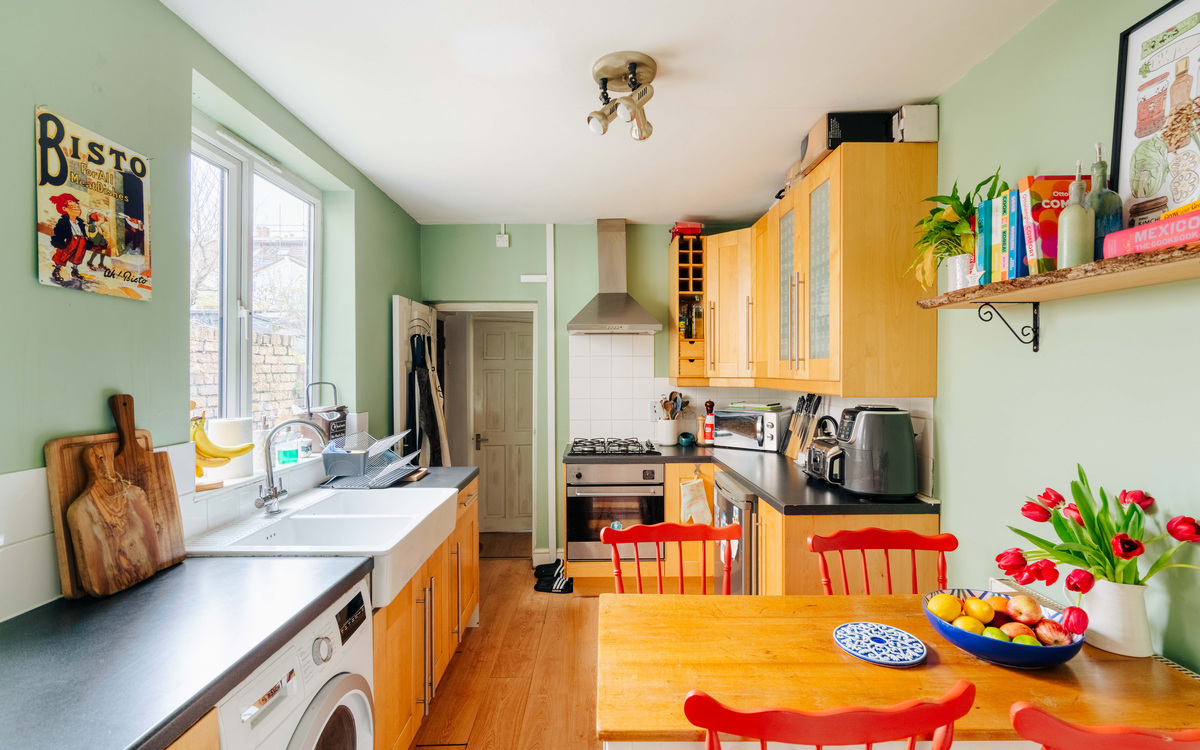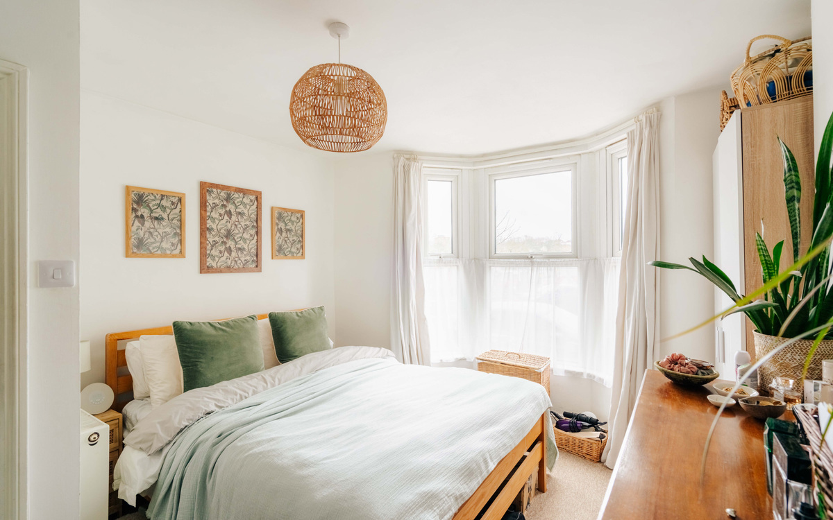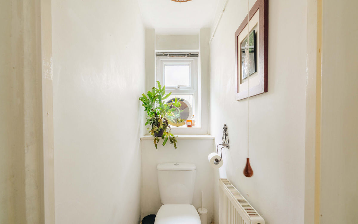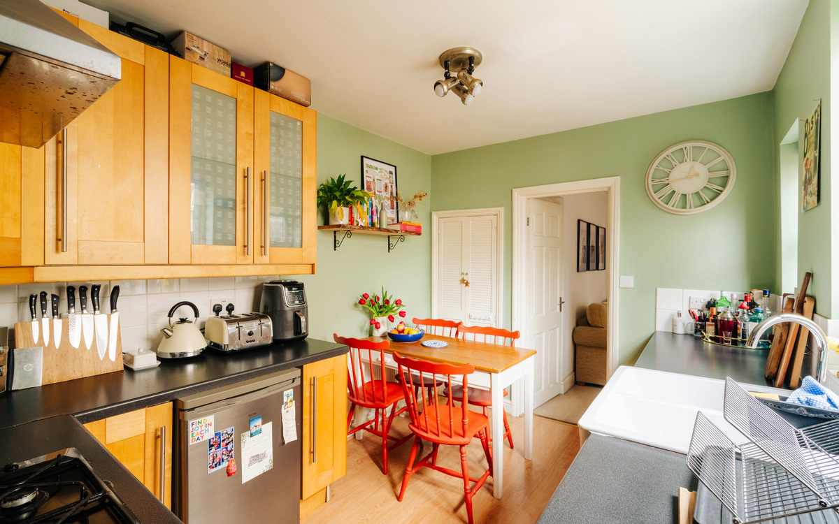 The home is well-presented throughout, offering a modern and fresh feel from the moment you step inside. A well-kept communal entrance leads into the property’s welcoming hallway. At the front of the home, the bay-fronted principal bedroom enjoys plenty of natural light and benefits from sleek storage fitted neatly into the alcoves. The living room is contemporary and inviting, complete with stylish built-in shelving that enhances the clean, minimalist design. To the rear, the layout flows effortlessly into a well-appointed kitchen and bathroom with a separate WC, creating a practical yet polished living space perfectly suited to today’s lifestyle. A home office at the rear of the garden completes the plan.