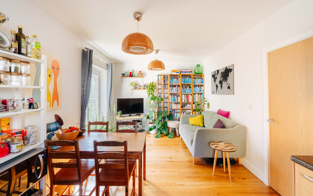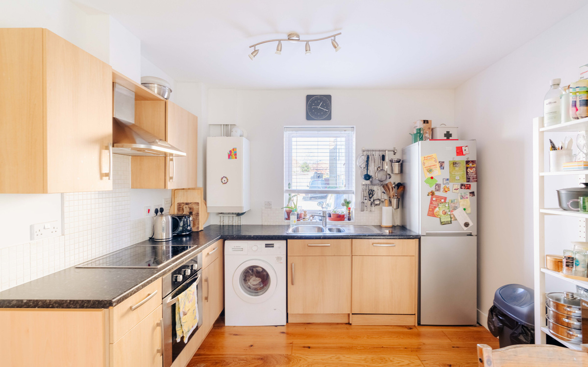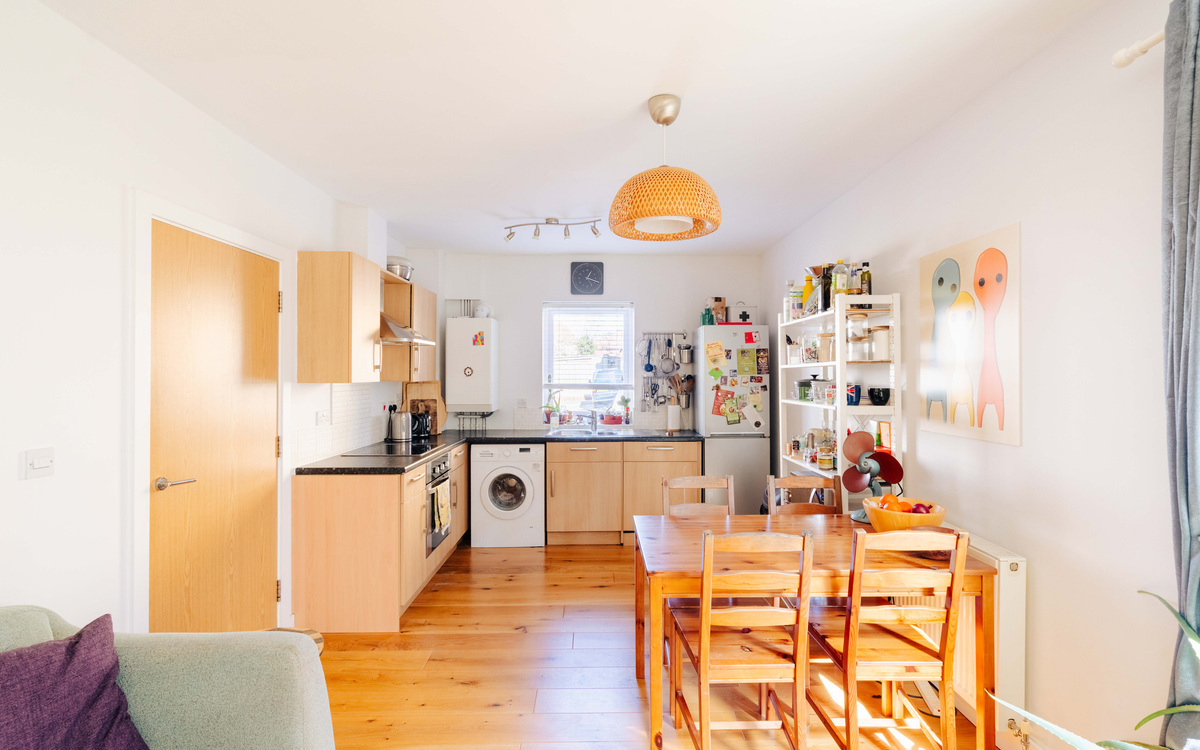The kitchen itself is thoughtfully arranged in an L-shape, offering both style and practicality, and is fitted with an integrated oven, induction hob, and extractor hood and dishwasher. Completing the home, the current owner has installed new flooring throughout, giving the apartment a fresh, cohesive, and move-in-ready feel.