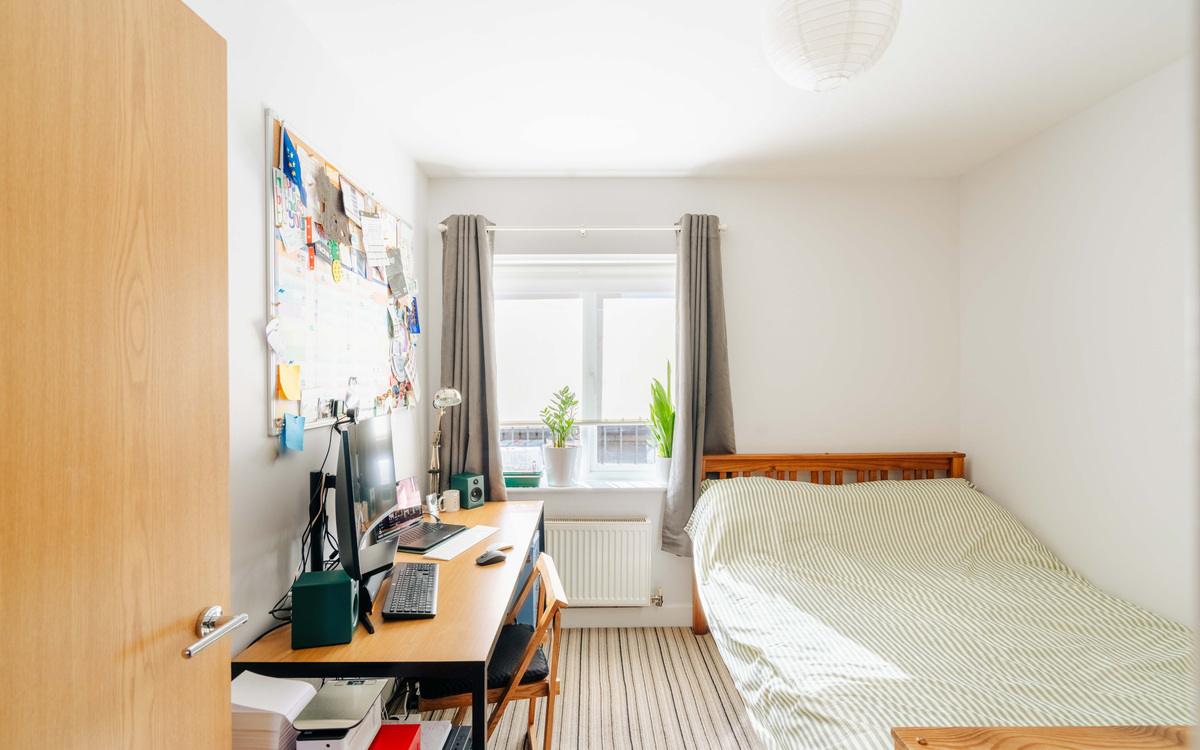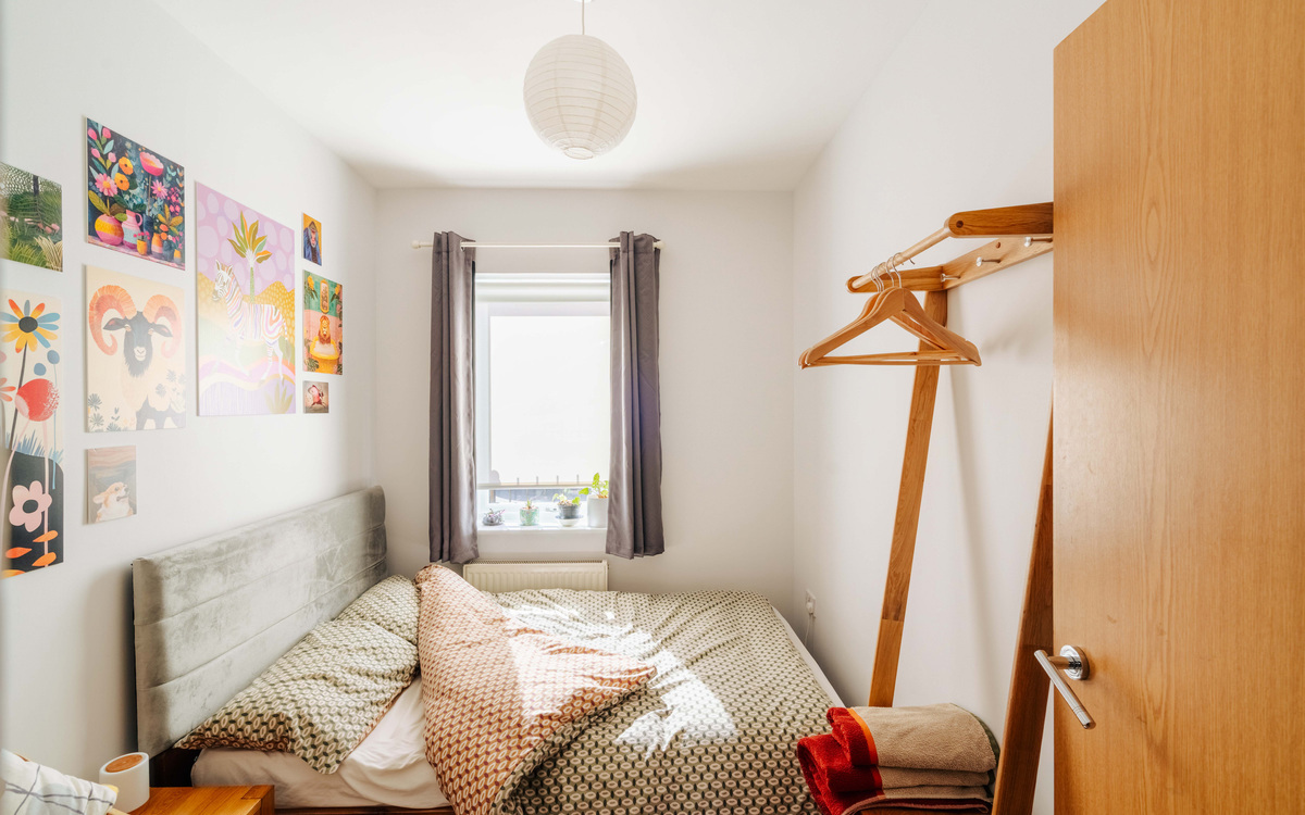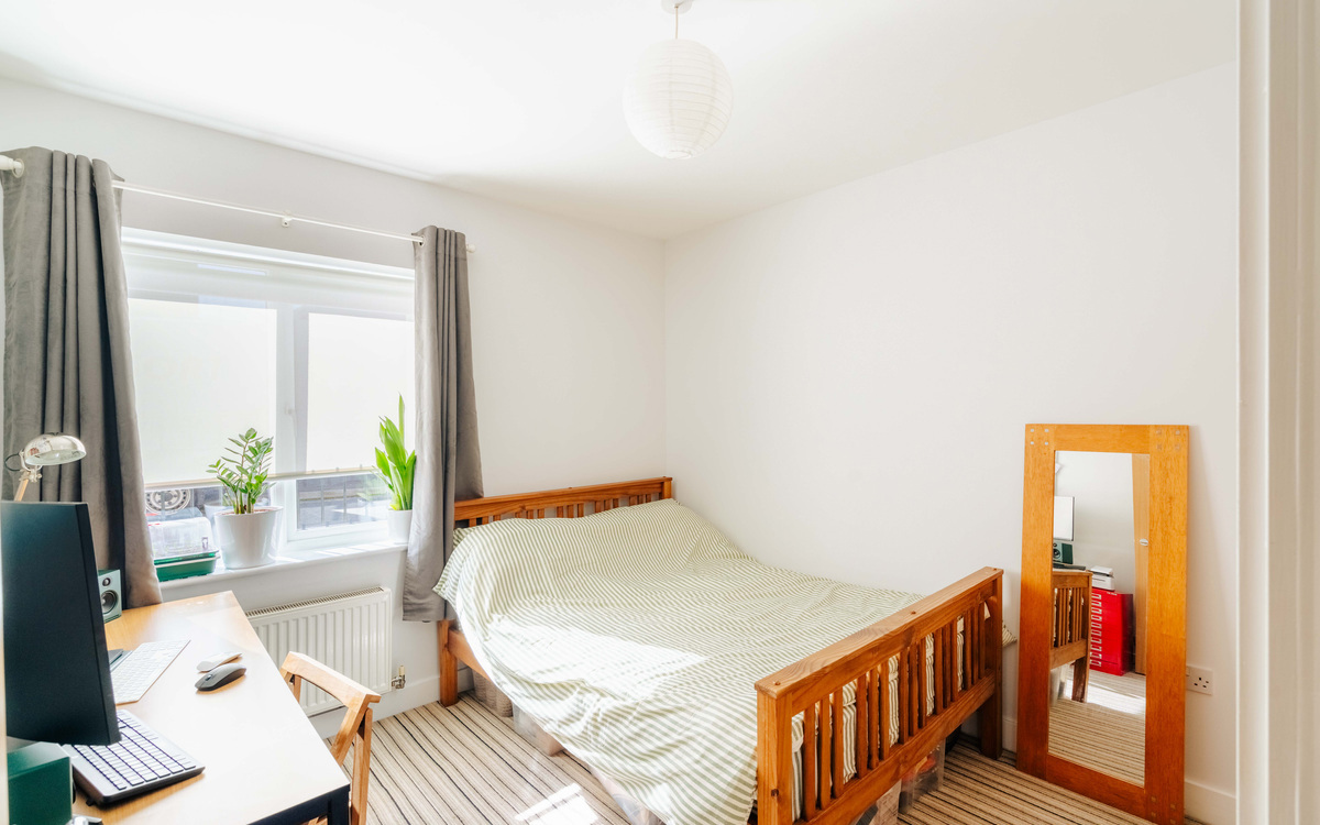 The apartment showcases two generous double bedrooms, both enjoying excellent natural light and a spacious, airy feel. The main bedroom is further enhanced by a built-in wardrobe, enhancing the clean and uncluttered finish.