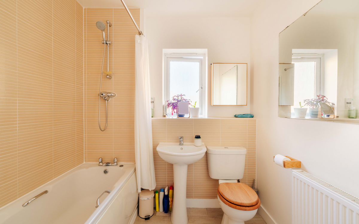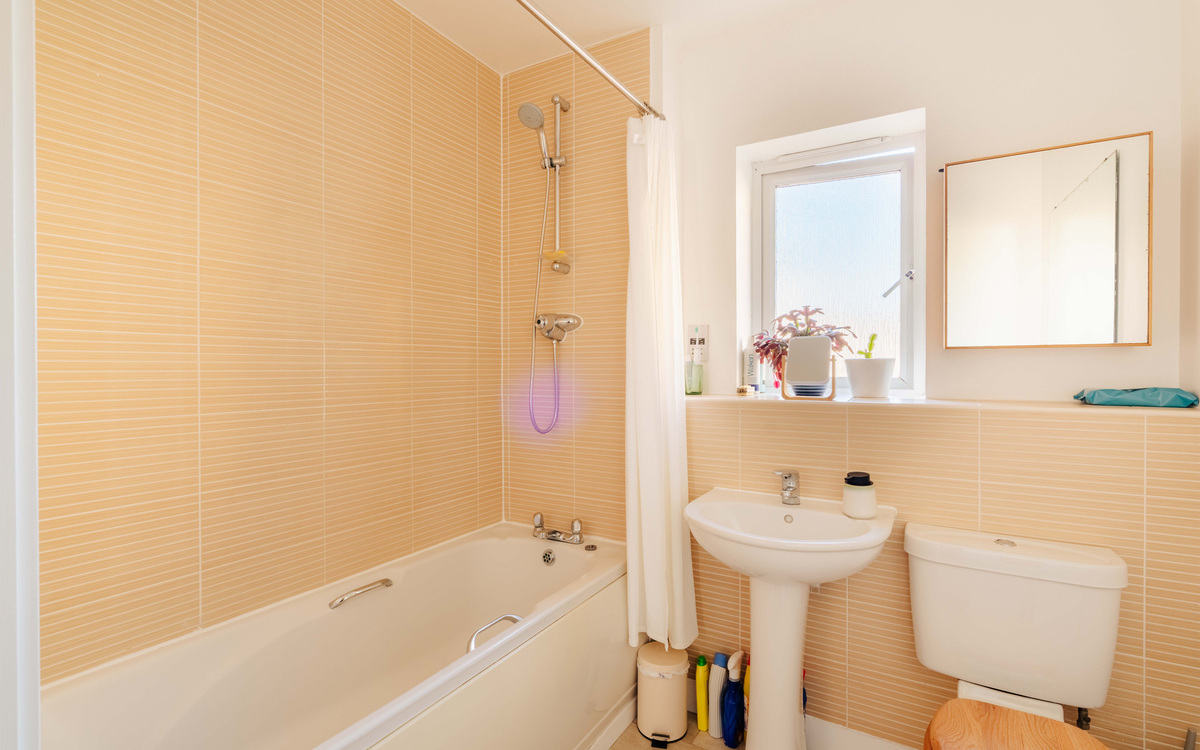 The bathroom is well-proportioned and finished in a calming, neutral palette, featuring sand-toned tiling set against crisp white walls. A full-sized bath with overhead shower offers both practicality and comfort, while a window allows natural light to flood the space, adding to the bright and fresh ambiance.
