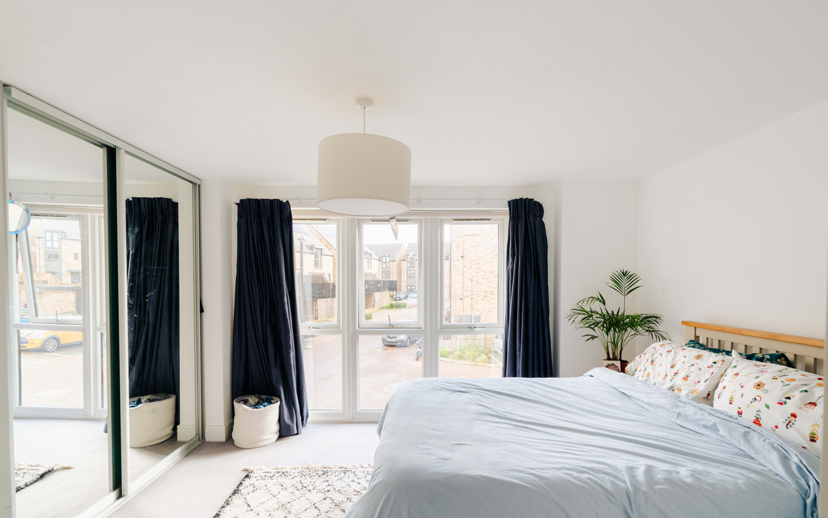 To the right of the hallway sits the bedroom, a wonderfully bright and calming space where the excellent natural light is immediately apparent. A large mirrored built-in wardrobe spans one wall, providing generous storage while reflecting light around the room - a feature that feels both sleek and considered.