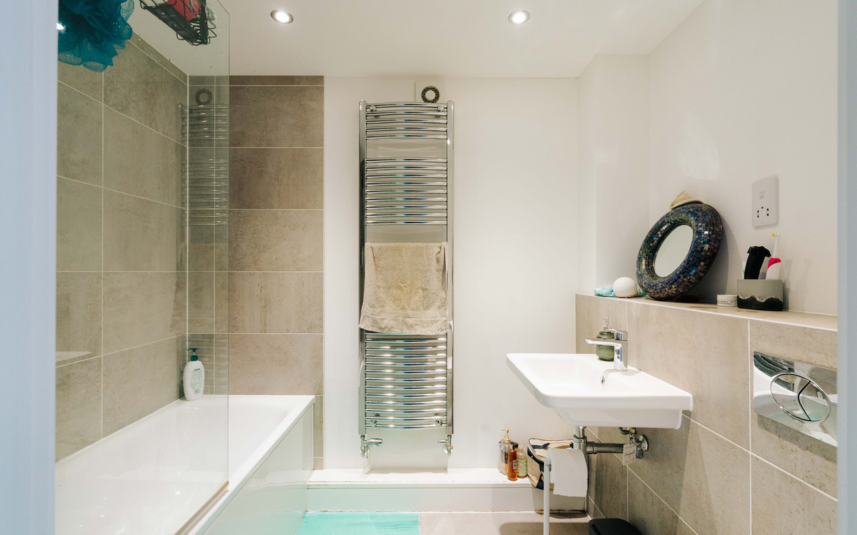 The bathroom continues the home’s modern styling, finished with a sophisticated stone-effect tiled surround against crisp white walls. Spot lighting above enhances the contemporary feel, while the well-proportioned three-piece suite offers both comfort and practicality.