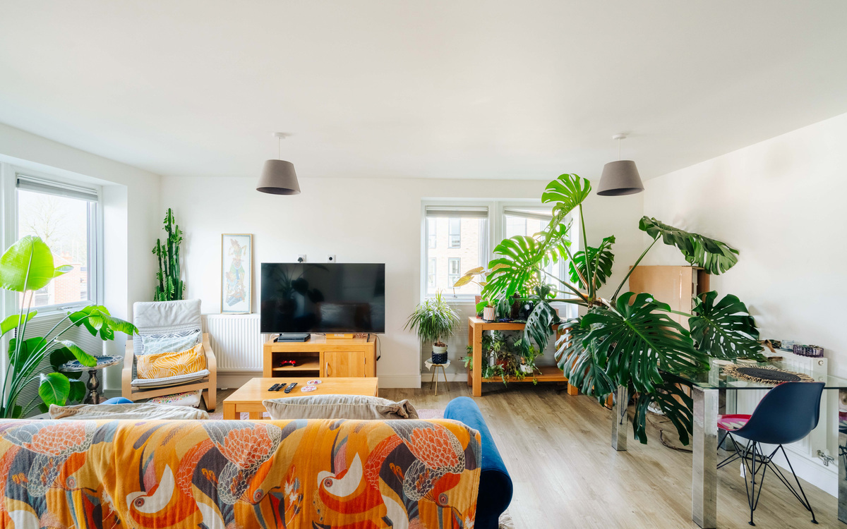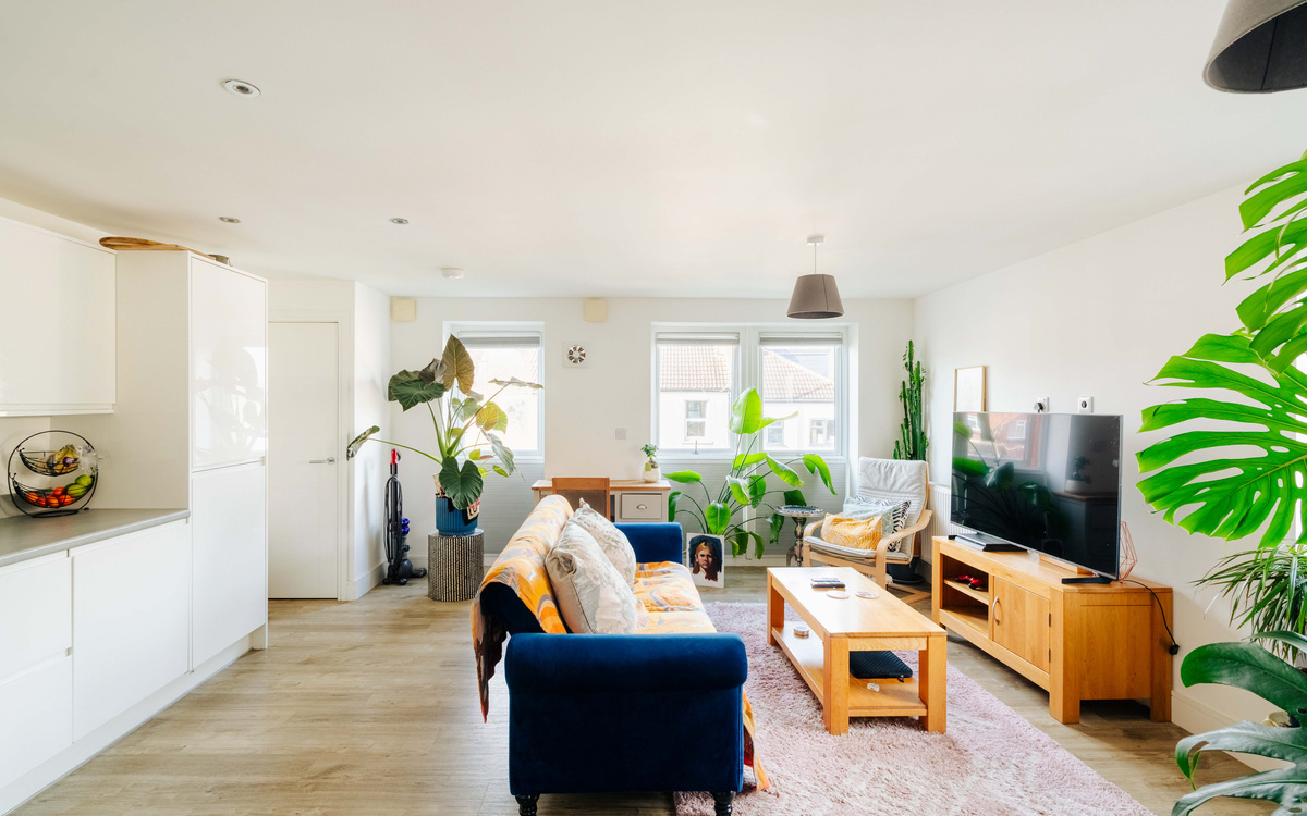 The living area is particularly impressive thanks to its dual-aspect windows, which flood the room with natural light throughout the day and offer a delightful outlook towards the iconic Clifton Suspension Bridge. The bright atmosphere is further enhanced by sleek ceiling spotlights, creating a space that feels both welcoming and stylish - ideal for relaxing or entertaining.