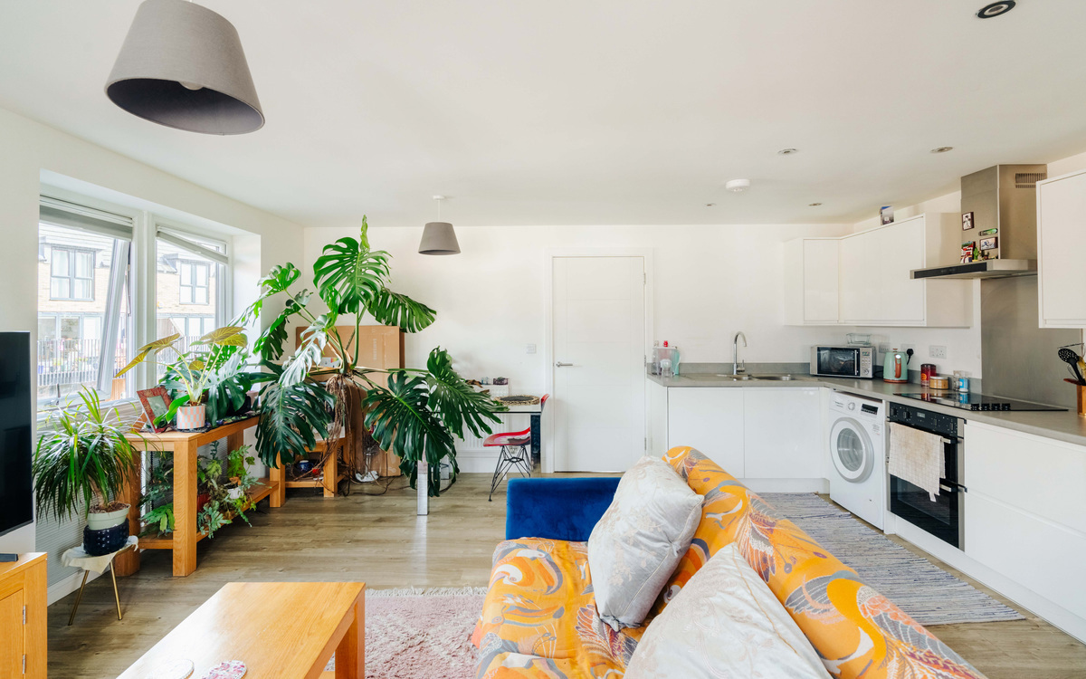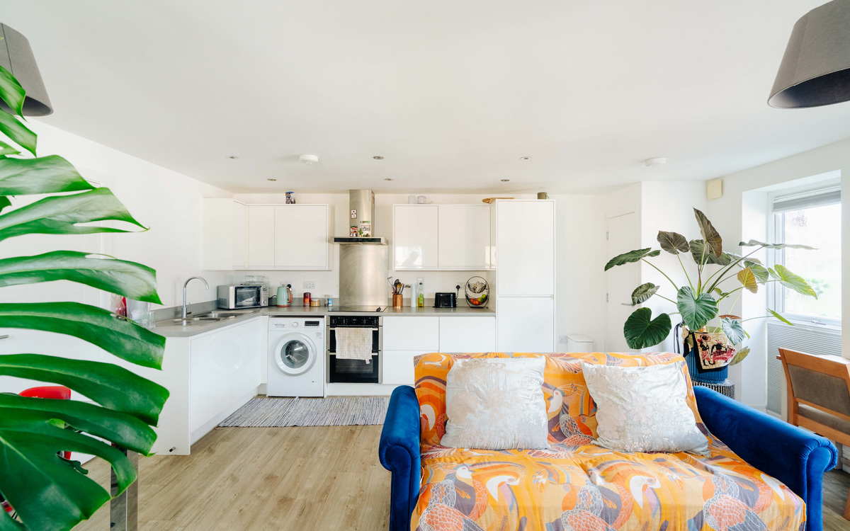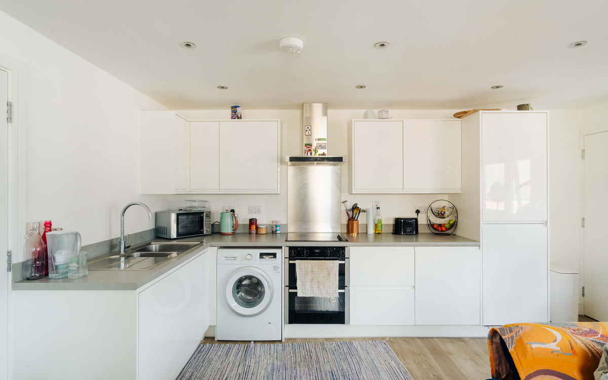 The true heart of the apartment is the open-plan lounge, kitchen and dining space, designed to maximise both light and usability. The L-shaped kitchen provides excellent preparation space and is well equipped with a range of integrated appliances, including an oven, induction hob with extractor hood, dishwasher and fridge freezer, along with dedicated space for a washing machine.