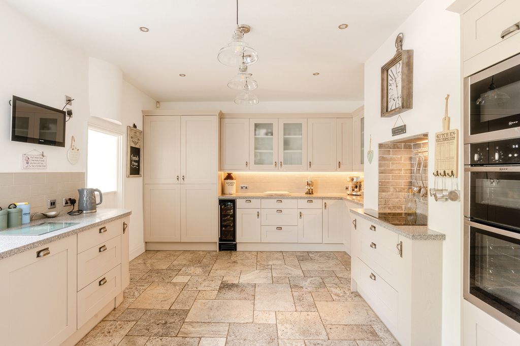 A substantial Edwardian home with an imposing double-fronted façade, The Old School House offers four reception rooms, four well-sized bedrooms, and a layout that works as well for day-to-day living as it does for hosting. At the top of the house, a private roof terrace enjoys far-reaching views across open countryside, while the garden has been thoughtfully designed to make the most of its space, featuring an outdoor kitchen and a separate bar. In addition, the property benefits from ample parking and a spacious garage.