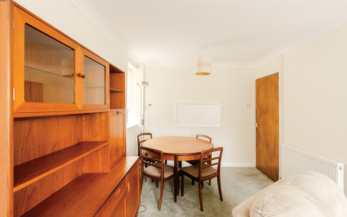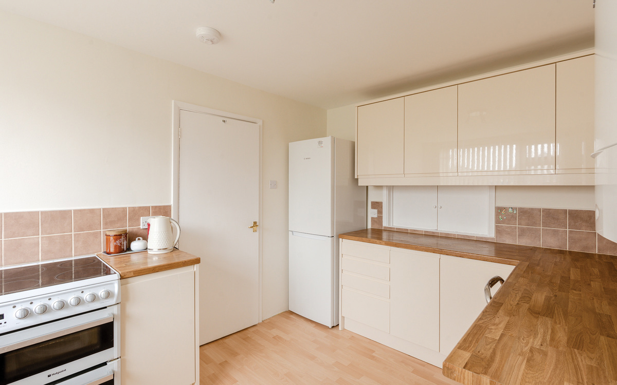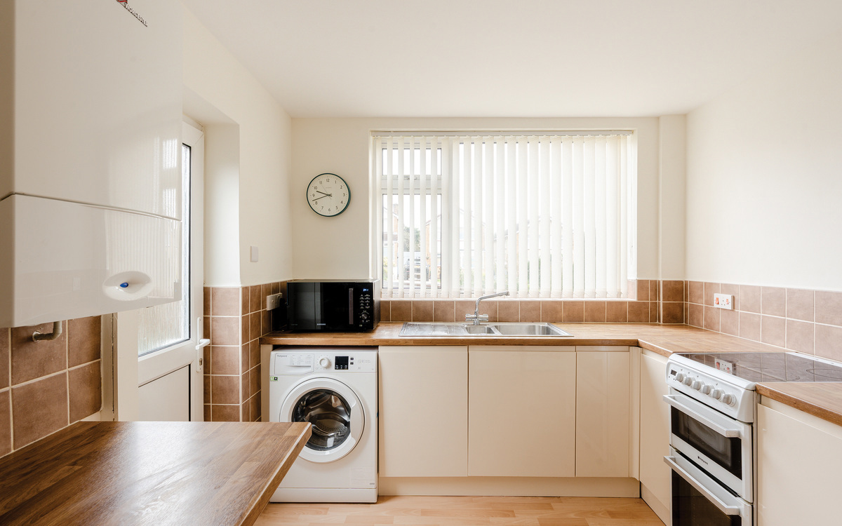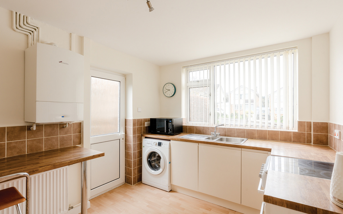 The kitchen is at the front of the house, and a hatch opens to the lounge linking these two rooms.