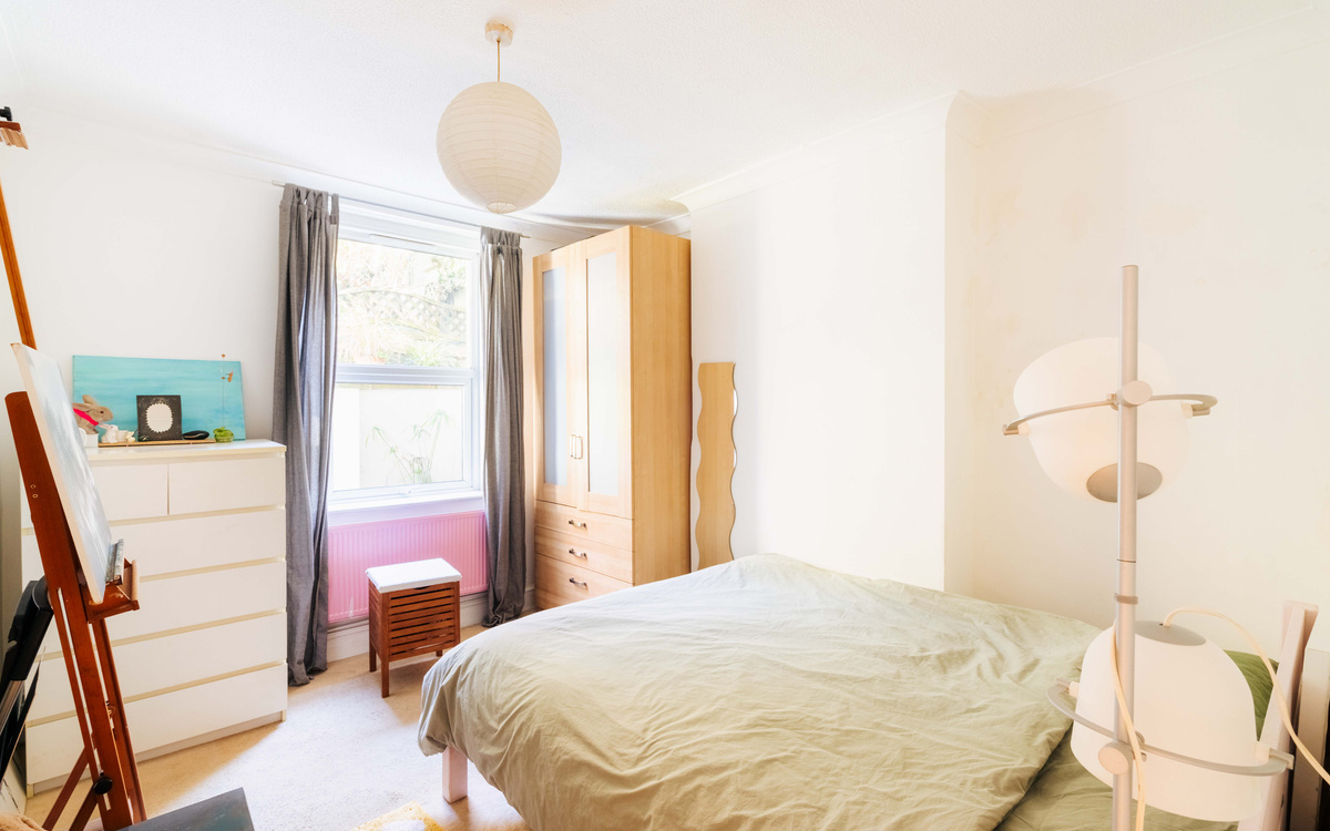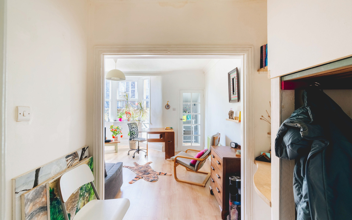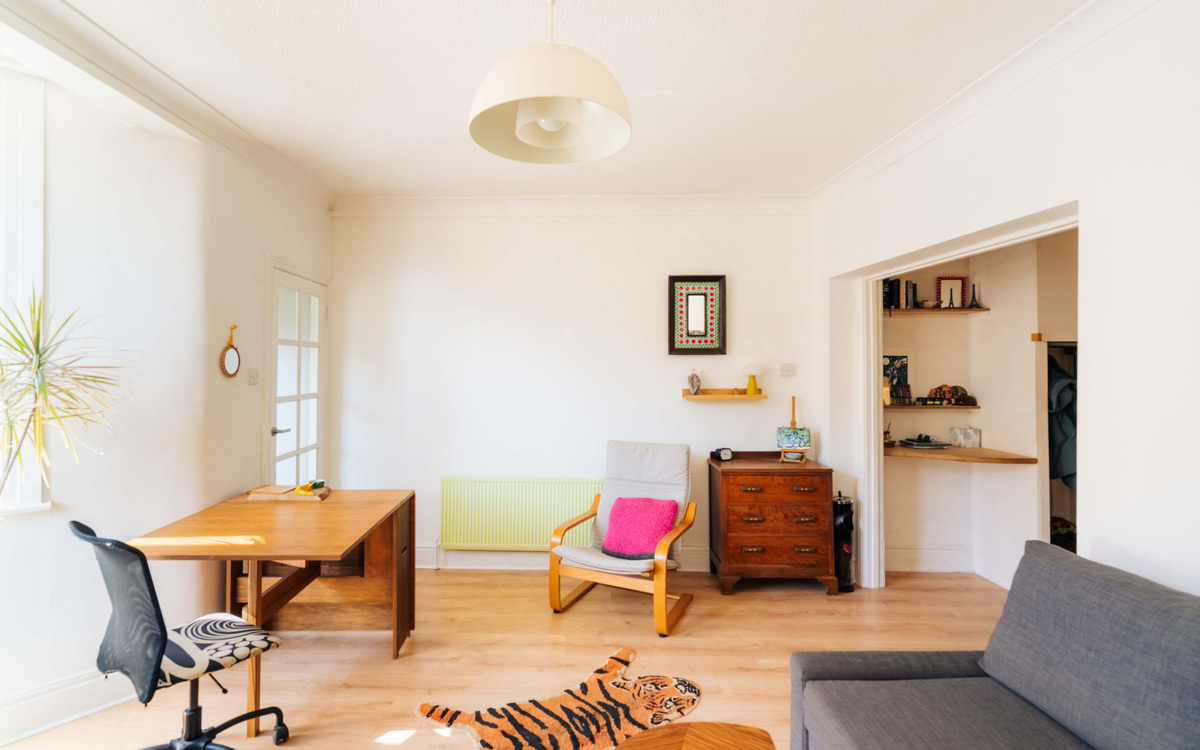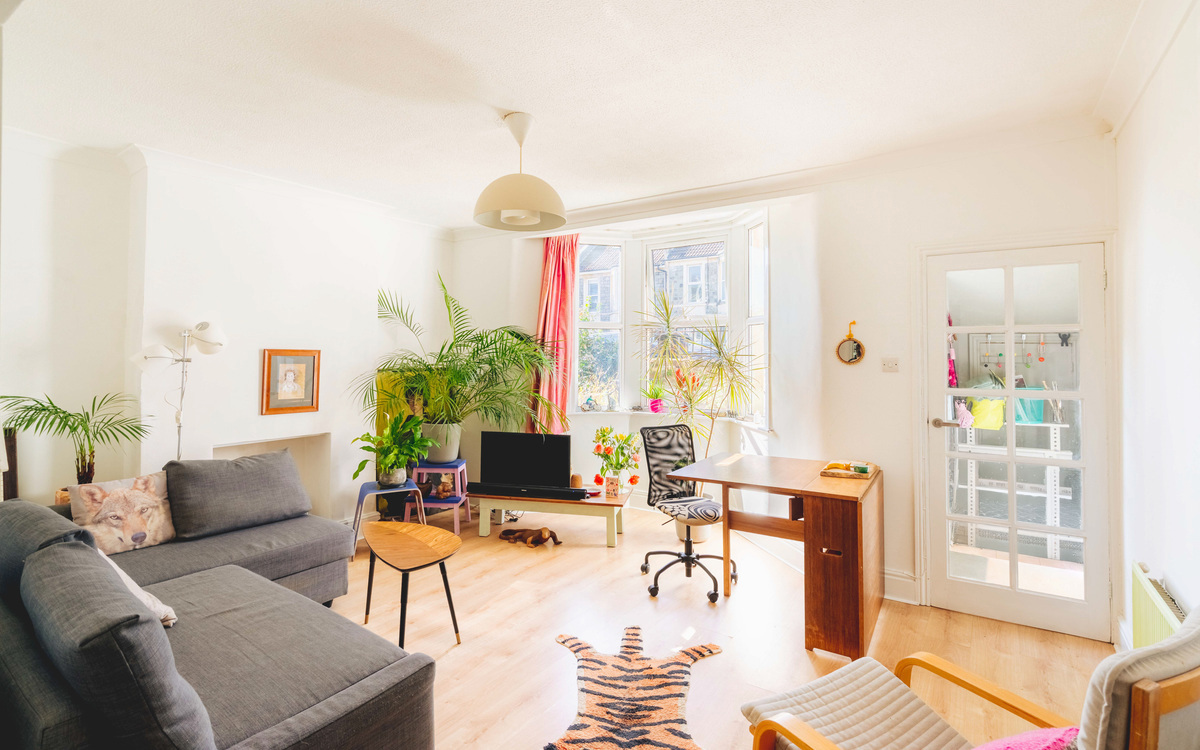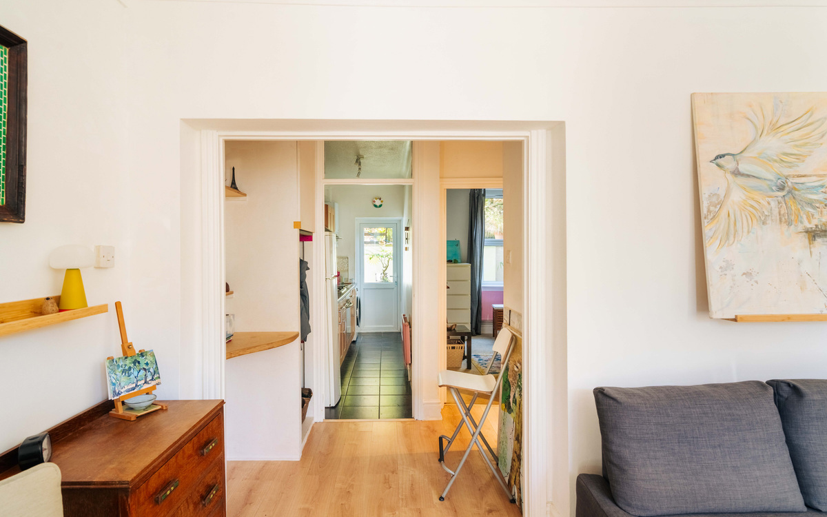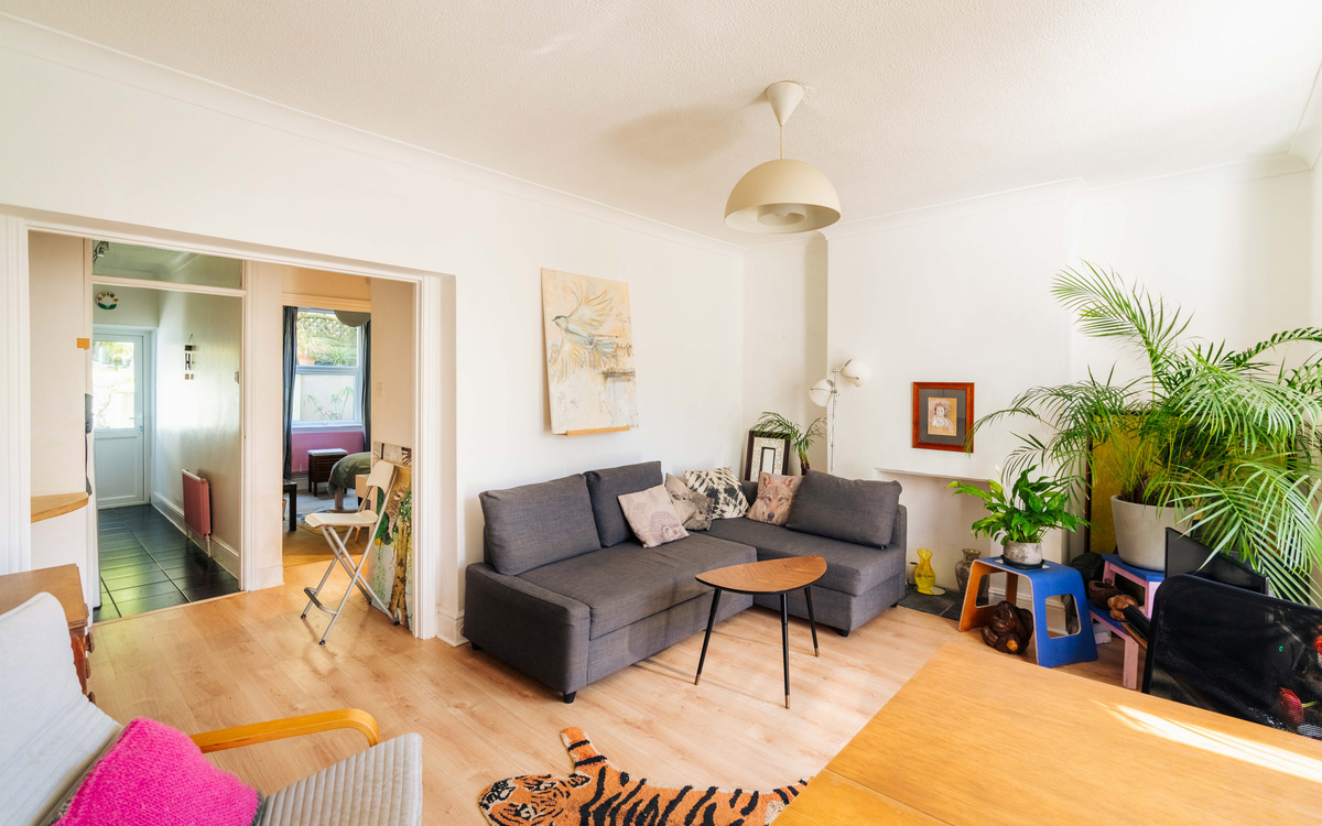 The apartment itself is a bright and inviting one-bedroom garden flat with its own private entrance—ideal for those seeking a home with both character and independence. You are welcomed in via a handy entrance porch, opening into a spacious living room where a bay window draws in an abundance of natural light, creating a warm and sociable atmosphere.