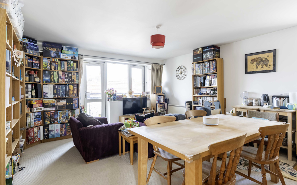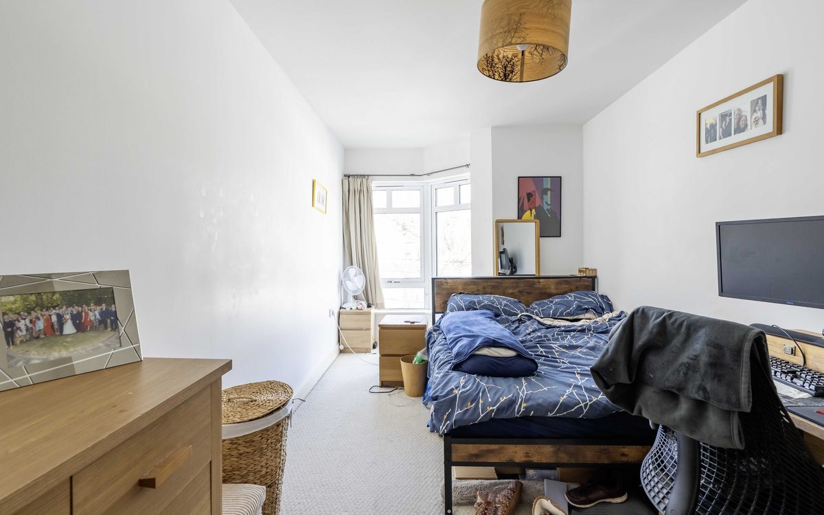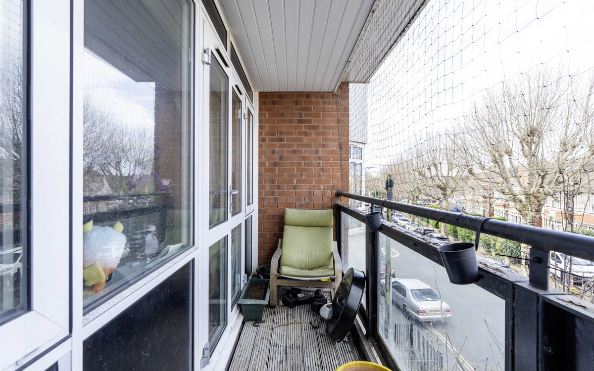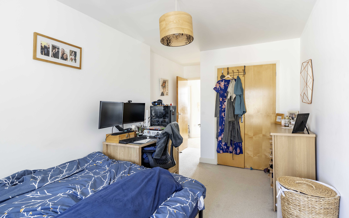 One of the biggest flats in this well-known development offering a large balcony and no onward chain. The entrance hall has doors to all rooms and a storage cupboard, the open-plan lounge/dining/kitchen has ample room for furniture, and the fitted kitchen has some integrated appliances and space for a dining table. The main bedroom has a bay window overlooking the front and a fitted wardrobe, the second bedroom overlooks the rear and the bathroom has a modern white suite. The balcony is accessed via doors from the lounge. The development has a lift, bike storage, bin storage and the communal areas are well-maintained to include a lawn garden with an array of plants, shrubs and garden benches to relax on.